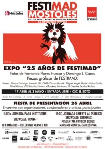 Además, del 17 de abril al 3 de mayo, el Centro Socio Cultural El Soto acogerá la exposición 25 años de Festimad, con imágenes gráficas de las sucesivas ediciones del Festival en Móstoles y diseños e ilustraciones de alguno de los mejores profesionales del país, como Óscar Mariné, Miguel Ángel Martín o Mauro Entrialgo, y fotografías de Domingo J. Casas y Fernando Flores Huecas. Un recorrido visual por uno de los eventos culturales contemporáneos de más repercusión en España.