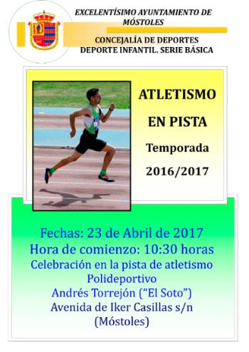 Imagen en alta resolución. Este enlace se abrirá mediante lightbox, puede haber un cambio de contextoLa Concejalía de Deportes organiza, con la colaboración de la Asociación Atlética de Móstoles, el próximo domingo 23 de abril en el polideportivo Andrés Torrejón, la Jornada de Deporte Infantil, serie básica, de atletismo en pista, temporada 2016/2017. En la misma competirán las categorías prebenjamín (nacidos en el 2009-2010), benjamín (2007-2008), alevín (2005-2006) e infantil (2003-2004).