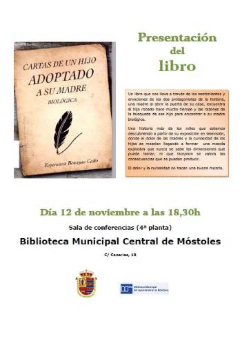 PRESENTACIÓN 12 de noviembre 2015Imagen en alta resolución. Este enlace se abrirá mediante lightbox, puede haber un cambio de contextoPRESENTACIÓN 12 de noviembre 2015La Biblioteca Municipal Central organiza el próximo 12 de noviembre la presentación del libro "Carta de un hijo adoptado a su madre biológica" de Esperanza Benayas Caño. El acto tendrá lugar a las 18,30 horas en la sala de conferencias de la Biblioteca (4ª planta).