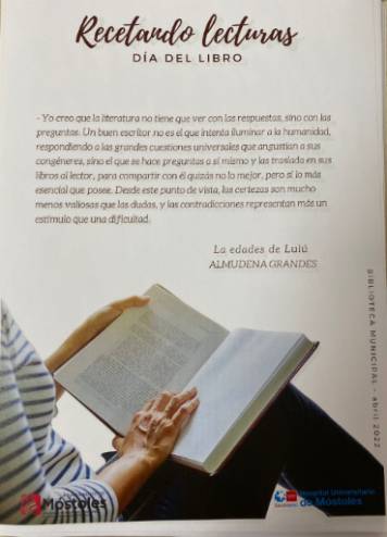 "Recetando Lecturas" es una iniciativa que surgió en 2017 como resultado de la colaboración del Ayuntamiento, a través de la Bibliotecas Municipales de Móstoles, y el Hospital Universitario para conmemorar el Día del Libro. Son ya cinco las ediciones de este proyecto. En 2020, la difícil situación provocada por la pandemia impidió que se celebrara.