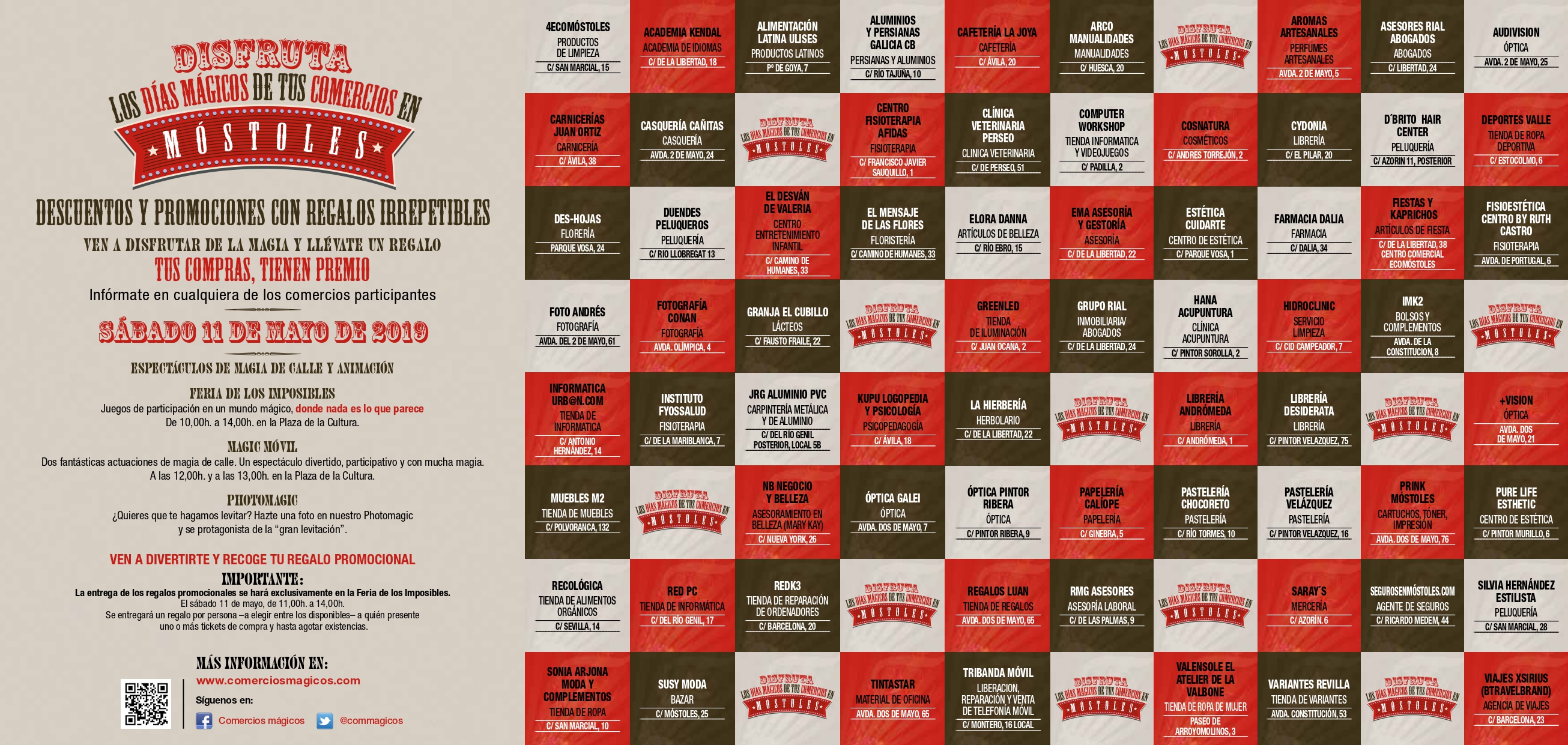 Cartel Comercios Mágicos 11 mayoImagen en alta resolución. Este enlace se abrirá mediante lightbox, puede haber un cambio de contextoCartel Comercios Mágicos 11 mayoMóstoles celebra el próximo sábado 11 de Mayo, en horario de 10:30 a 14:30 horas el DÍA MÁGICO DEL COMERCIO en la Plaza de la Cultura dentro del programa "Comercios Mágicos 2019" de promoción del comercio minorista. Un evento de la Comunidad de Madrid en colaboración con Móstoles Desarrollo del Ayuntamiento de Móstoles.