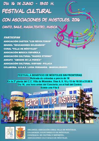 Imagen en alta resolución. Este enlace se abrirá mediante lightbox, puede haber un cambio de contextoLa Asociación Coral Villa de Móstoles organiza, con la colaboración de la concejalía de Cultura y Deportes, y diversas asociaciones culturales del municipio, un Festival a beneficio de `Móstoles sin Fronteras´. El festival se celebrará el próximo 16 de junio a las 19,00 horas en el Teatro Villa de Móstoles. Contará con actuaciones musicales, baile, magia y teatro, a cargo de los colectivos Asociación Castiza Los Revoltosos, Edusol Educadores Solidarios, Asociación Mágica Española, Asociación Cultural Madrid Eterno, Aseapo Amigos de la Poesía, Asociación Cultural Hispano-Polaca, con la colaboración de ADAP Luisa Fernanda- Manualidades.