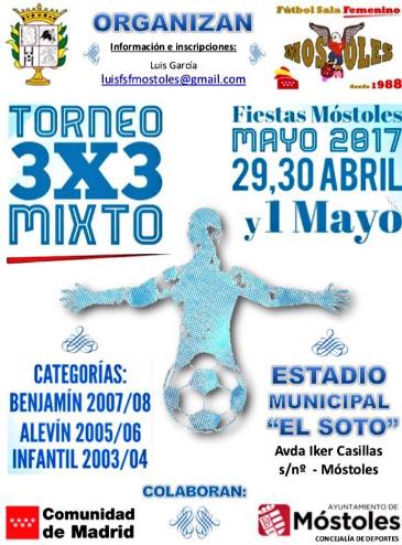 Imagen en alta resolución. Este enlace se abrirá mediante lightbox, puede haber un cambio de contextoLos días 29 y 30 de abril y el 1 de mayo se disputará en el estadio Municipal El Soto el Torneo 3x3 mixto de fútbol, organizado por el Club de Fútbol Sala Femenino Móstoles, con la colaboración de la Concejalía de Deportes. El campeonato forma parte del programa deportivo de las fiestas del 2 de mayo y en él participarán equipos de niños y niñas de las categorías benjamín, alevín e infantil.