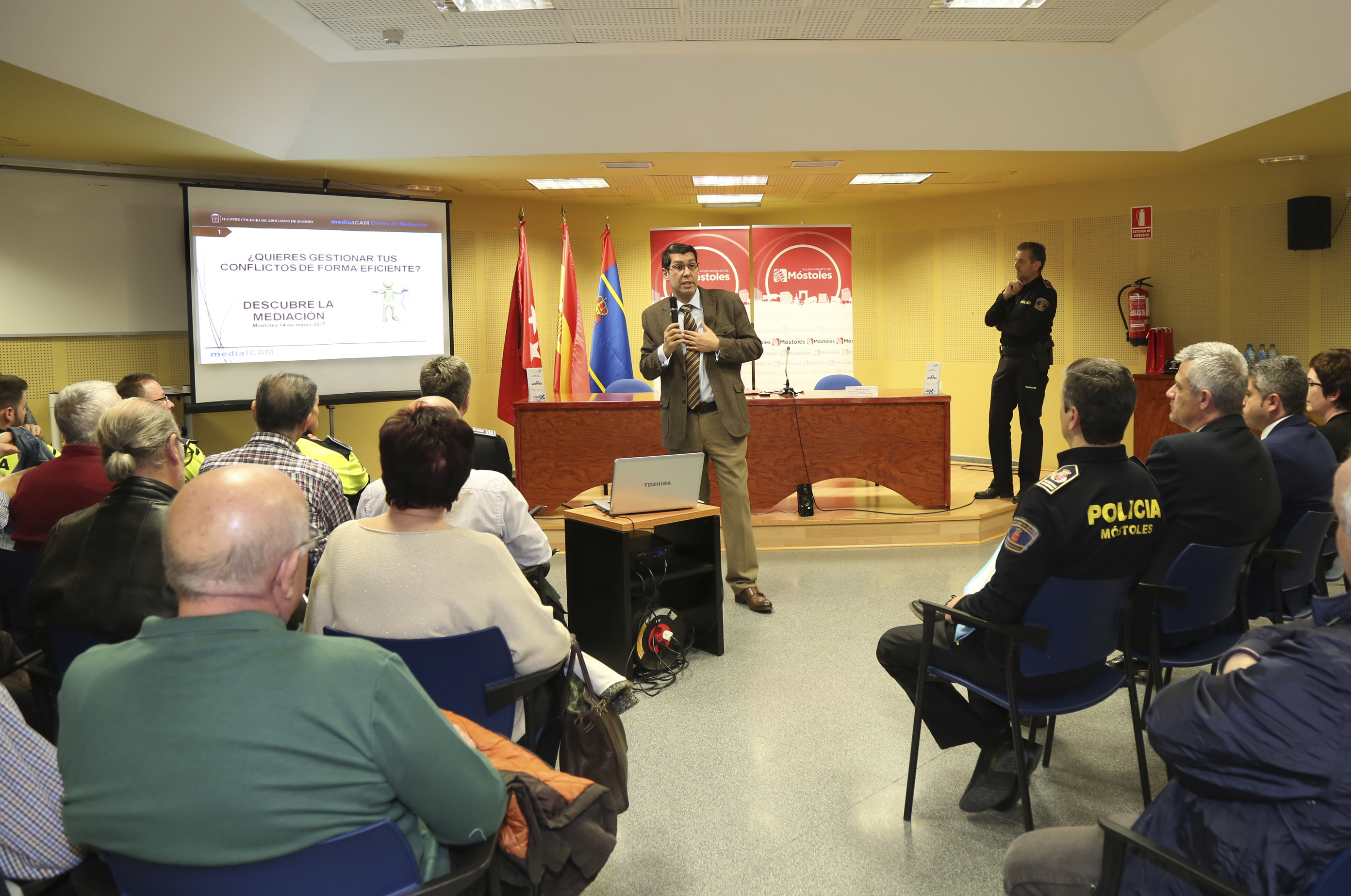 La jornada ha constado de dos ponencias, la primera impartida por el director del Centro de Resolución de Conflictos, medialCAM, del Ilustre Colegio de Abogados de Madrid, Fernando Bejarano, sobre cómo gestionar los conflictos de forma eficiente y la segunda, a cargo del Jefe de Policía Municipal de Móstoles, Juan Manuel Arribas, que ha versado sobre la mediación policial.