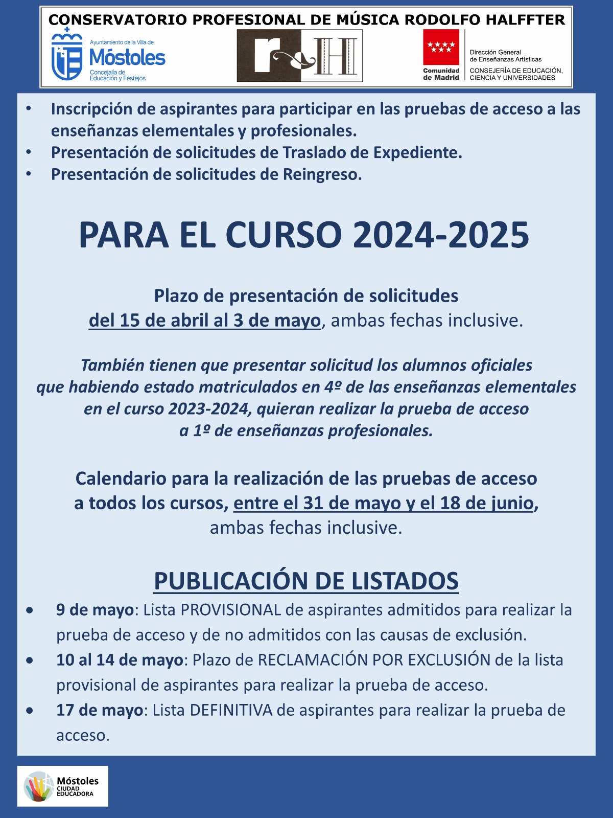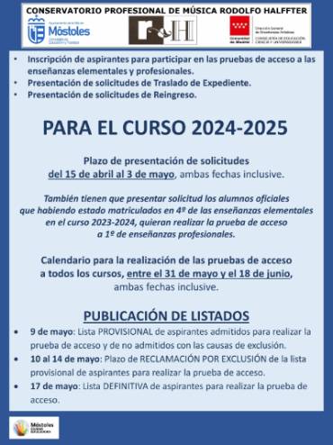 Para más información, los interesados pueden acceder al enlace https://www.mostoles.es/Conservatorio/es, en el apartado Pruebas de acceso 2024-2025.