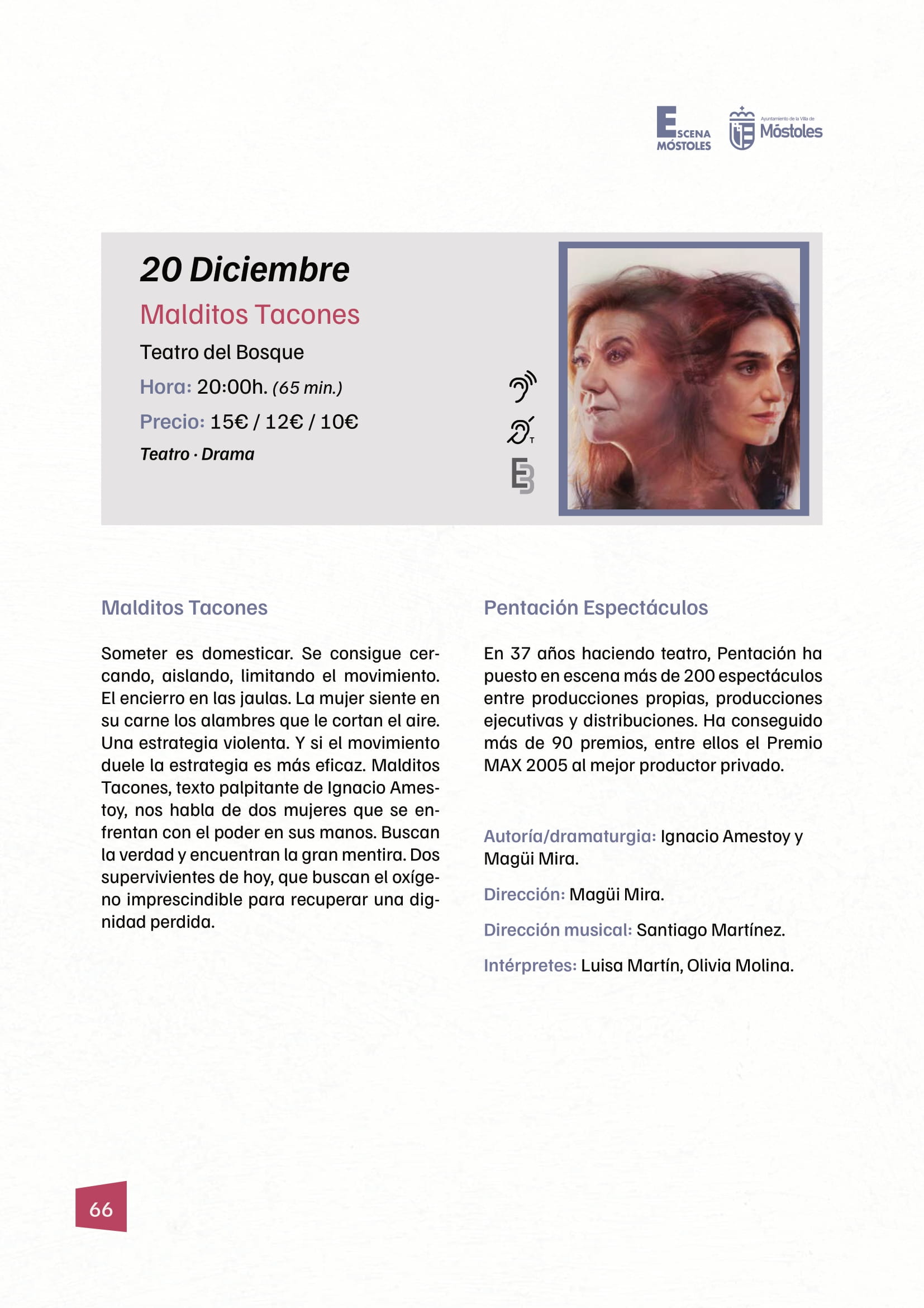 destacada agendadestacada agendaLa obra "Malditos tacones", protagonizada por Luisa Martín y Olivia Molina y dirigida por Magüi Mira, destaca en la agenda cultural de esta semana, diseñada por el Ayuntamiento de Móstoles, a través de la Concejalía de Cultura, Desarrollo y Promoción Turística, que también ofrece música, teatro y espectáculos para todos los públicos.
