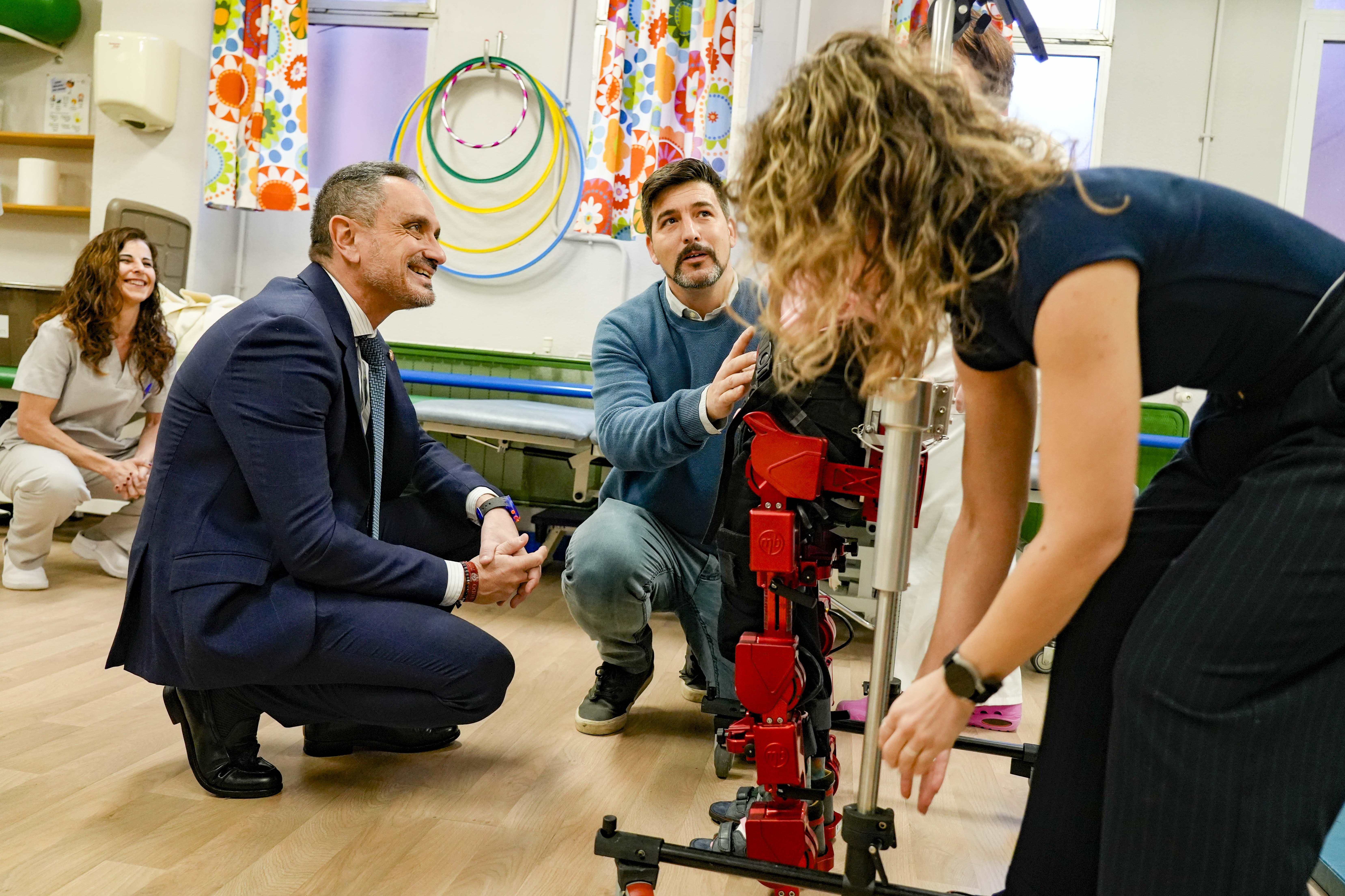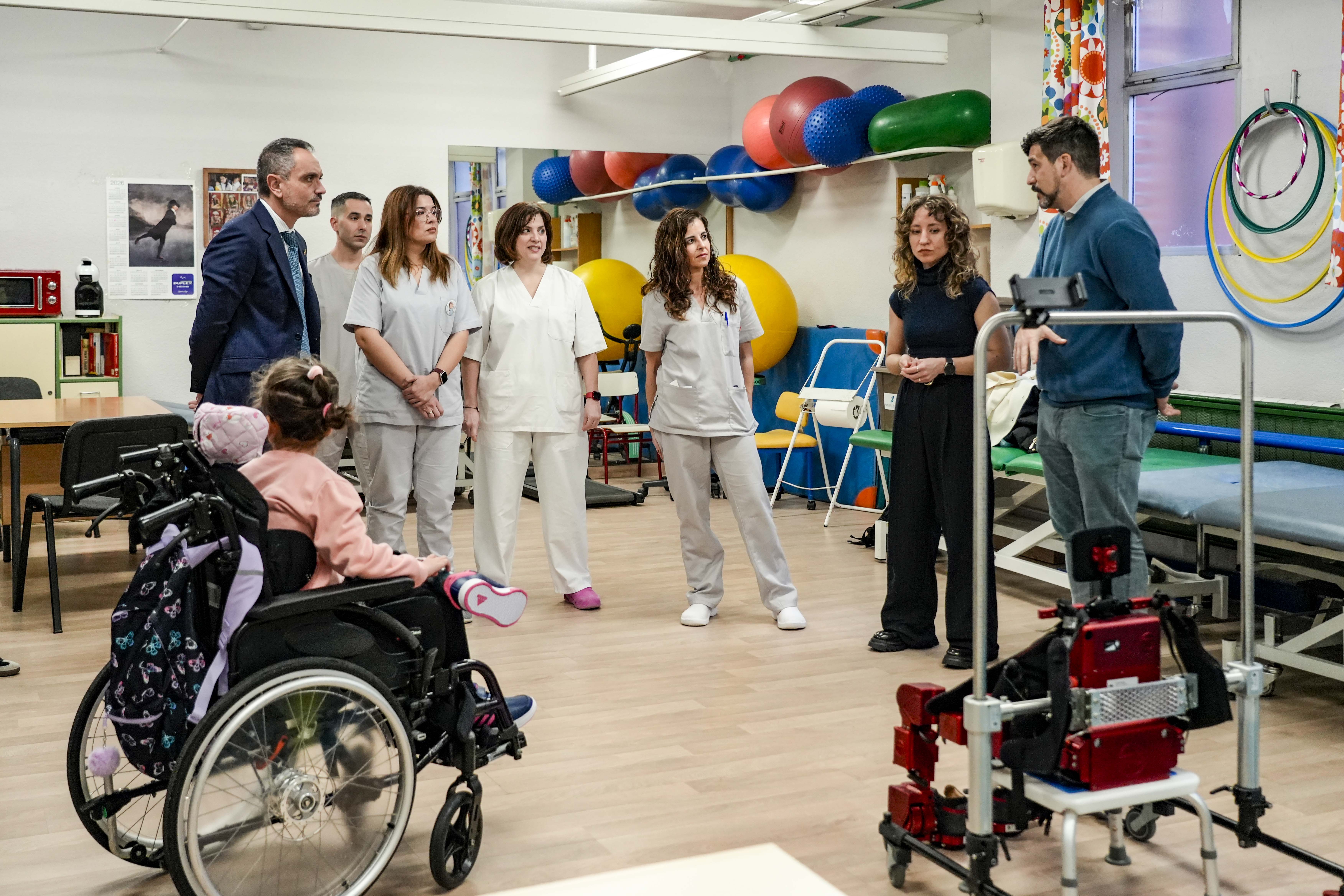 Alumnos del CPEE Miguel de Unamuno de Móstoles realizan sesiones de tratamiento de fisioterapia con un exoesqueleto, aportando al niño la sensación de caminar por sí mismo y facilitando al terapeuta la posibilidad de interactuar con el paciente cara a cara, sin necesidad de mantenerse detrás sujetándolo.