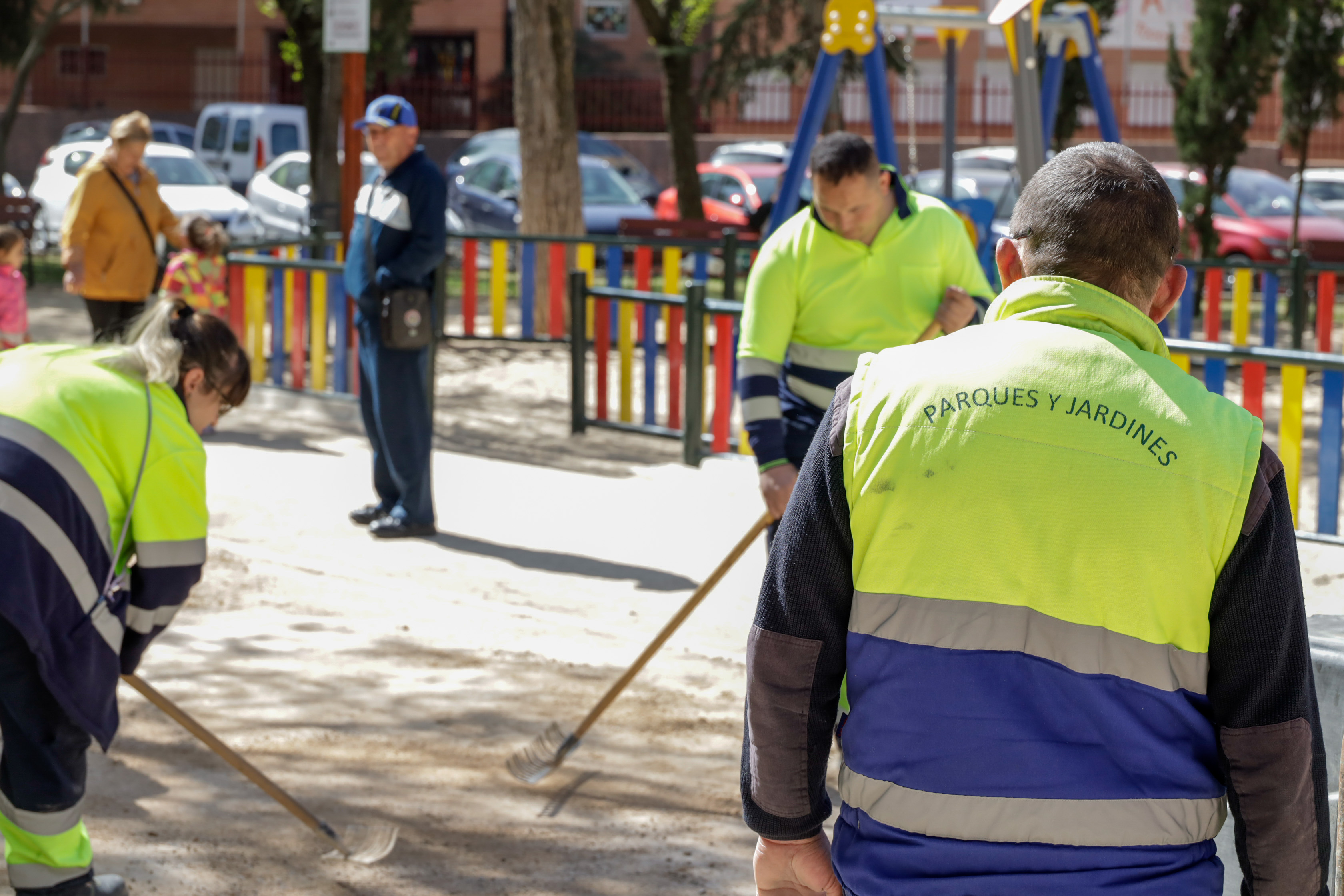 La Alcaldesa de Móstoles, Noelia Posse, acompañada de la Concejala de Empleo y Nuevas Tecnologías, el Concejal de Mejora y Mantenimiento de los Espacios Públicos, David Muñoz y la Portavoz de Podemos, Mónica Monterreal, ha visitado hoy a los peones de jardinería en el parque de Castilla-La Mancha.