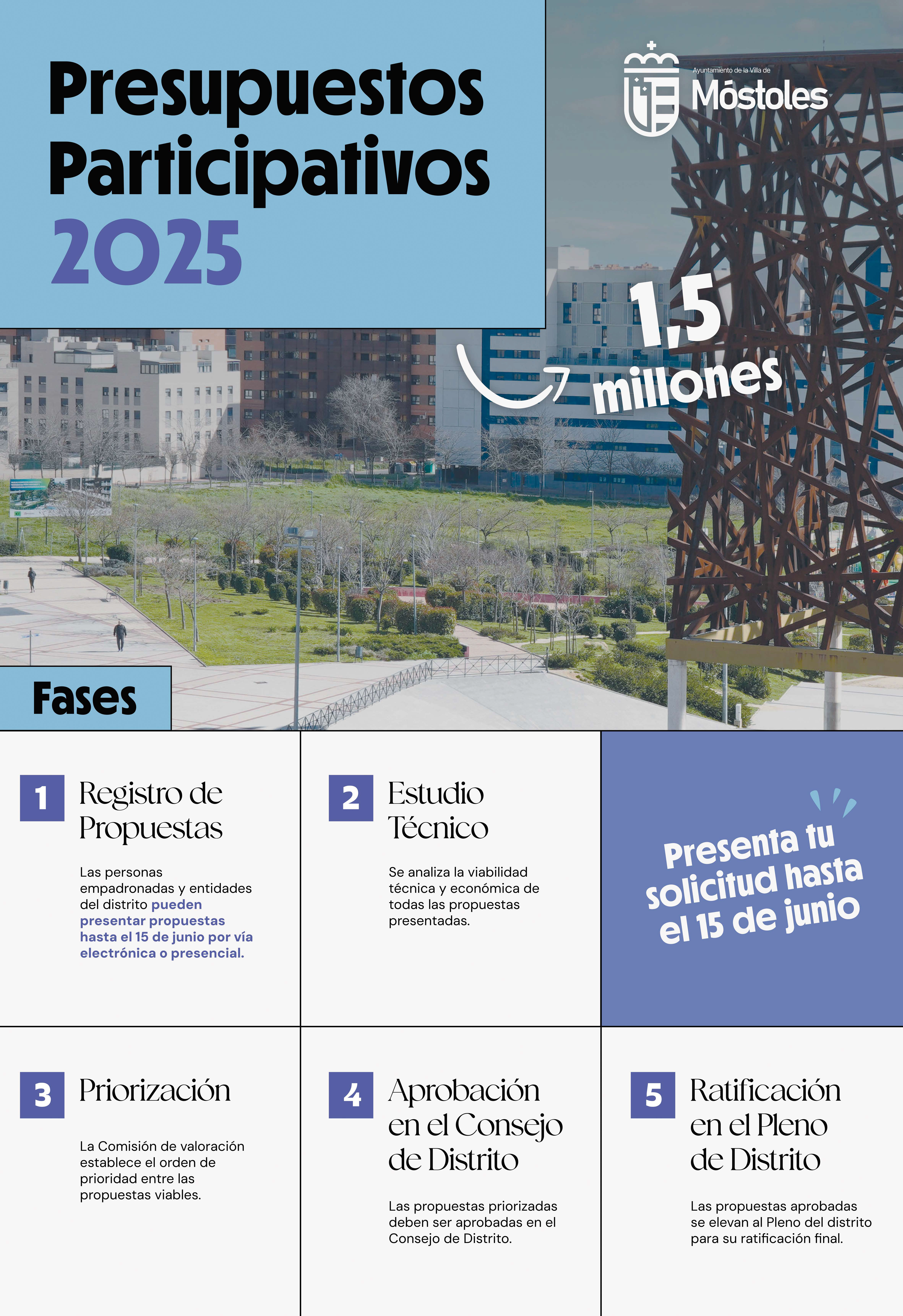 destacada Presupuestos Participativos 2025destacada Presupuestos Participativos 2025El Ayuntamiento de Móstoles, a través de la Concejalía de Participación Ciudadana, está trabajando en la elaboración de los presupuestos participativos, destinados a la mejora y rehabilitación de barrios, atendiendo a los acuerdos aprobados en las Juntas de Distrito, a propuesta de vecinos y entidades de este ámbito territorial.