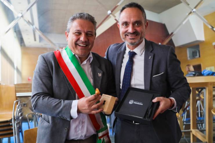 - El alcalde de Móstoles, Manuel Bautista, ha recibido a Giovanni Gargano, alcalde del municipio italiano Castelfranco Emilia, quienes han asistido a esta puesta en escena en el Teatro del Bosque.