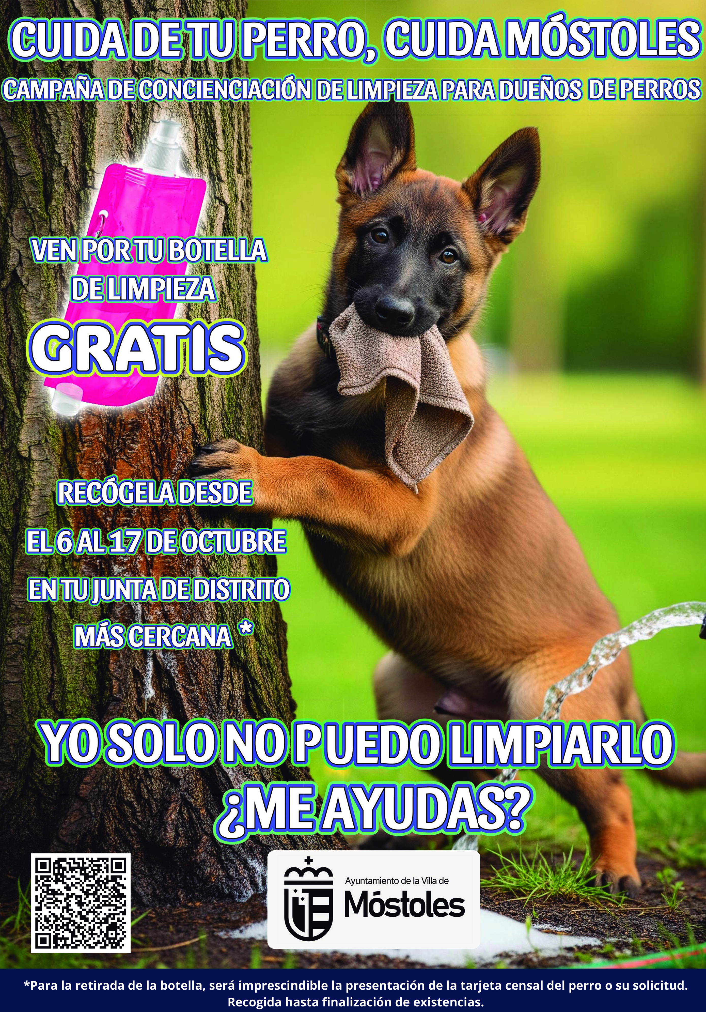 El Ayuntamiento de Móstoles, a través de la Concejalía de Deportes y Sanidad, va a distribuir, de manera gratuita, botellas de limpieza a los dueños de los perros para que diluyan los orines en la vía pública y mantenerla limpia.