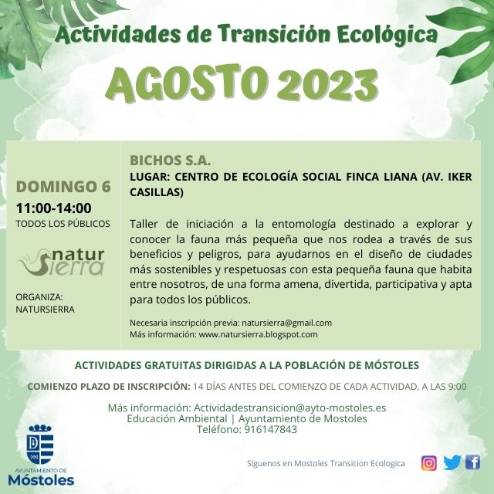 Taller Bichos SA o cómo iniciarse en el mundo de los insectosTaller Bichos SA o cómo iniciarse en el mundo de los insectosEl Ayuntamiento de Móstoles te propone un plan para este fin de semana. El domingo 6 de agosto llega al Centro de Ecología Social de Parque Finca Liana ‘Bichos S.A’, un taller de iniciación a la entomología con el objetivo de explorar y conocer la fauna más pequeña que nos rodea, a través de sus beneficios y peligros.