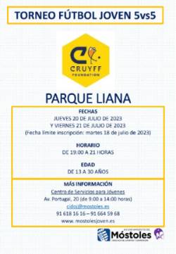 La Concejalía de Juventud y Cooperación, junto a un grupo de jóvenes participantes del programa municipal "CallejeaMos", organiza el Torneo de Fútbol Joven – Johan Cruyff 5vs5, que se disputará los días 20 y 21 de julio, de 19:00 h a 21:00 h, en el Parque Finca Liana. El torneo se celebrará uno de los días o los dos según el número de equipos participantes.
