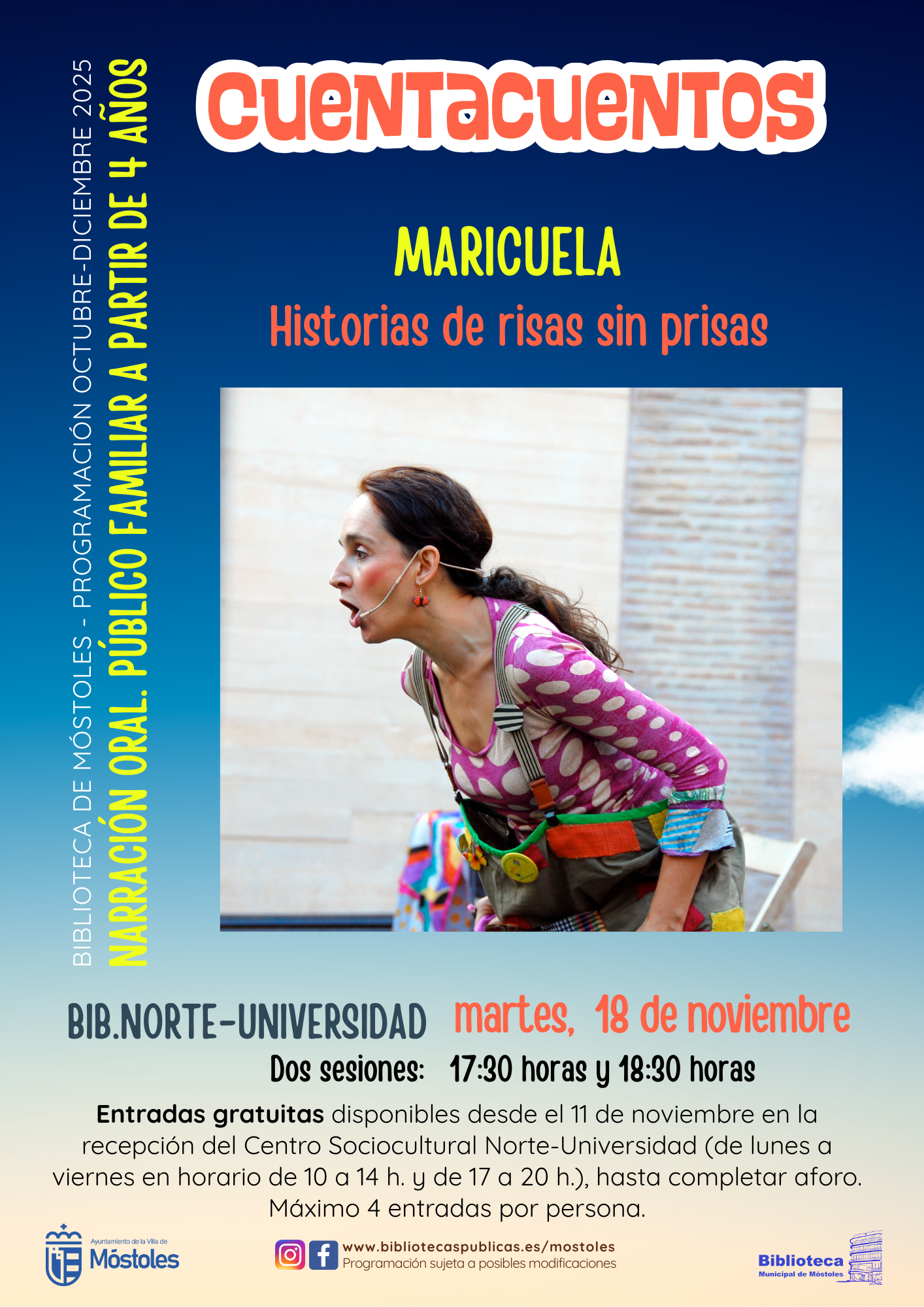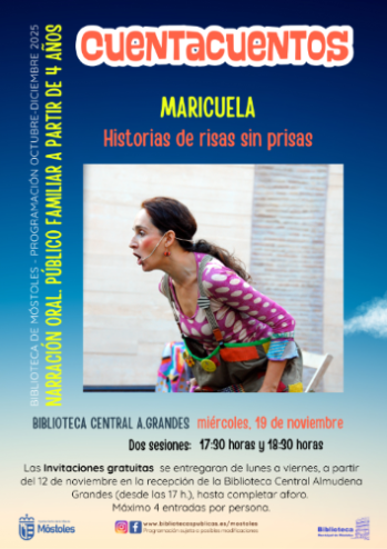 El martes 18, los niños a partir de cuatro años podrán escuchar las "Historias de risas sin prisas", gracias a Maricuela, en la Biblioteca del Centro Sociocultural Norte-Universidad, a las 17:30 h y a las 18:30 h, en 2 sesiones de 30 minutos. Este cuentacuentos es un espectáculo con palabras, objetos, títeres, poemas, libros, cantos y cuentos que harán las delicias de los más pequeños. El miércoles 19 se celebrará este cuentacuentos en la Biblioteca Central, en el mismo horario. Las entradas son gratuitas, previa retirada de invitaciones en la recepción del propio centro donde se celebre.