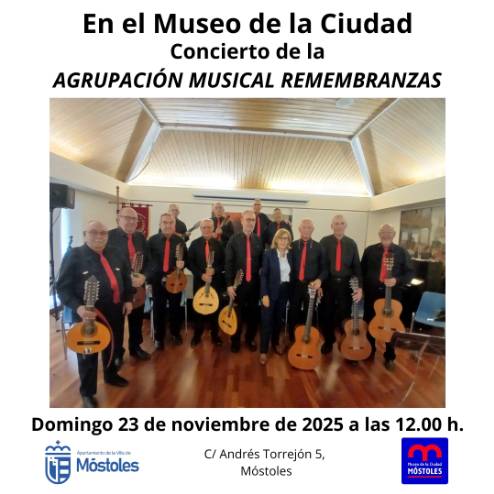 La música, también tendrá protagonismo el domingo 23, en el Museo de la Ciudad, a las 12:00 h, con el "Concierto de la Agrupación Musical Remembranzas". Esta vez se podrá disfrutar de música popular y tradicional, al son de boleros, pasodobles, zarzuelas, pasacalles y otros clásicos para recordar y disfrutar desde el corazón. La entrada es gratuita previa retirada de invitaciones en el propio centro a partir del martes 18 de noviembre.
