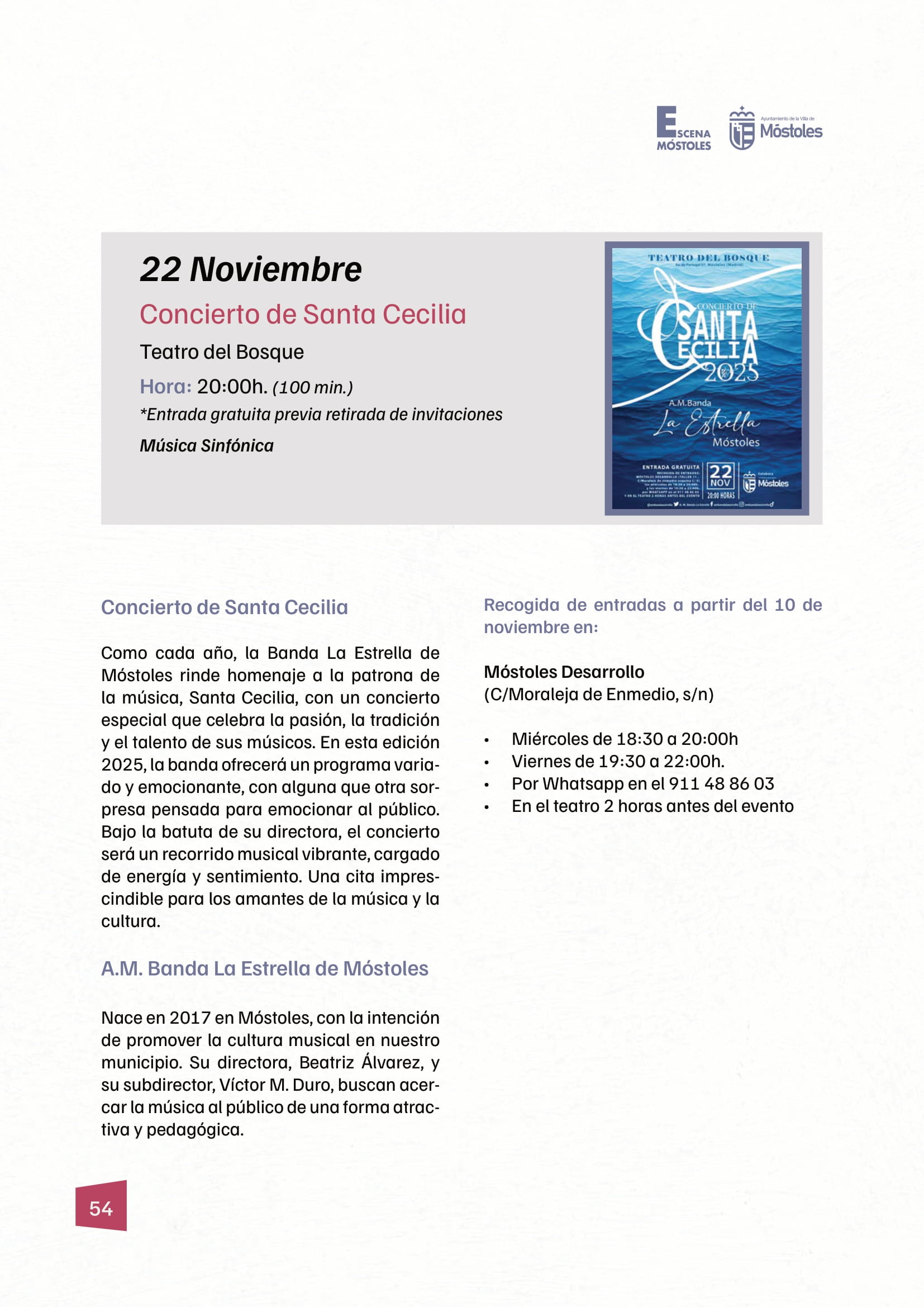 La programación cultural del sábado 22 de noviembre, se cerrará con el tradicional "Concierto de Santa Cecilia", a cargo de A. M. Banda La Estrella de Móstoles, en el Teatro del Bosque a las 20:00 h, con motivo de la Patrona de la Música que se celebra el 22 de noviembre. Bajo la batuta de su directora, Beatriz Álvarez, el concierto de música sinfónica ofrecerá sonidos armónicos, vibrantes, cargados de energía y sentimiento, con alguna sorpresa para sorprender al público. La entrada es gratuita, previa retirada de invitaciones.