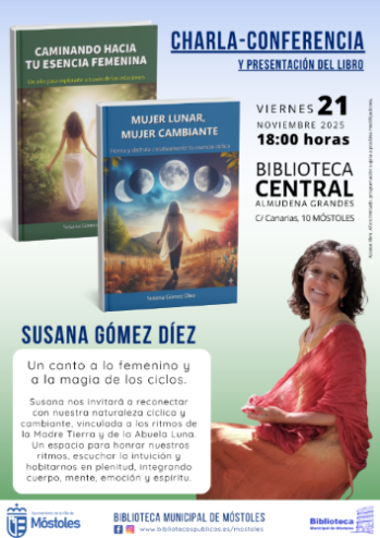 El viernes 21 tendrá lugar la presentación del libro y una charla-conferencia, "Mujer lunar, mujer cambiante", de Susana Gómez Díez, en la Biblioteca Central, a las 18:00 h. Esta diplomada en Educación Social, formada en diversas terapias como arteterapia, expresión corporal, yoga dinámico, relajación, desarrollo personal y técnicas energéticas y de cuerpo mente, nos invitará a reconectar con nuestra naturaleza femenina, cíclica y cambiante, vinculada a los ciclos de la Madre Tierra y de la Abuela Luna. También, el libro invita a explorar nuestra naturaleza cíclica, nuestros ritmos, aceptando los cambios con respeto, presencia y armonía, integrando cuerpo, mente, emoción y espíritu. La entrada es libre hasta completar aforo.