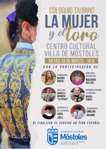 El jueves 13, a las 19:00 h, tendrá lugar en el Centro Cultural Villa de Móstoles el coloquio "La mujer y el toro", en el que participarán profesionales taurinas como la ganadera y veterinaria Macarena Gallego, la novillera Candela Aparicio "La Piyaya", la fotógrafa taurina y escritora Muriel Feiner, la alguacililla de Las Ventas Rocío López y la recortadora Carolina Delgado.