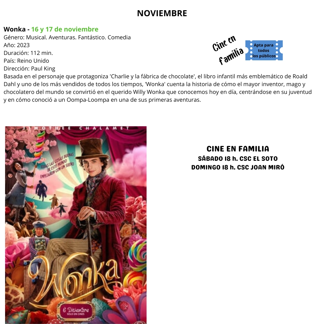 El programa "Cine en familia" está protagonizado esta semana por "Wonka", que se podrá ver el sábado 16, a las 18:00 h, en el Centro Sociocultural El Soto y el domingo 17 a las 18:00 h en el Centro Sociocultural Joan Miró.