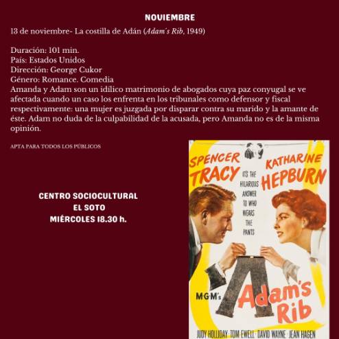 El ciclo de cine "Filmoteca" trae esta semana la película "La costilla de Adán" (Adam´s Rib, 1949), que se proyectará el miércoles 13 a las 18:30 h en el Centro Sociocultural El Soto.
