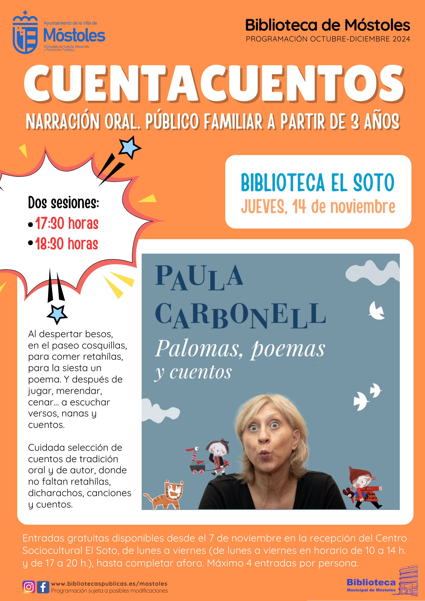 El jueves 14 Paula Carbonell estará en la Biblioteca El Soto a las 17:30 h y 18:30 h (dos sesiones de 30 minutos) con su cuentacuentos "Palomas, poemas y cuentos", dirigido a niños a partir de tres años.