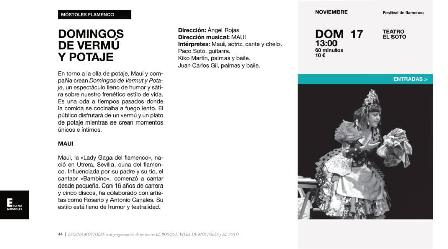 El domingo 17 continúa "Móstoles Flamenco" con "Domingos de vermú y potaje", interpretado por Maui y dirigido por el artista local Ángel Rojas, que se ofrecerá a las 13:00 h en el Teatro El Soto, y "Travesía", el nuevo espectáculo de Sandra Carrasco y David de Arahal que tendrá lugar a las 19:00 h en el Teatro Villa de Móstoles.