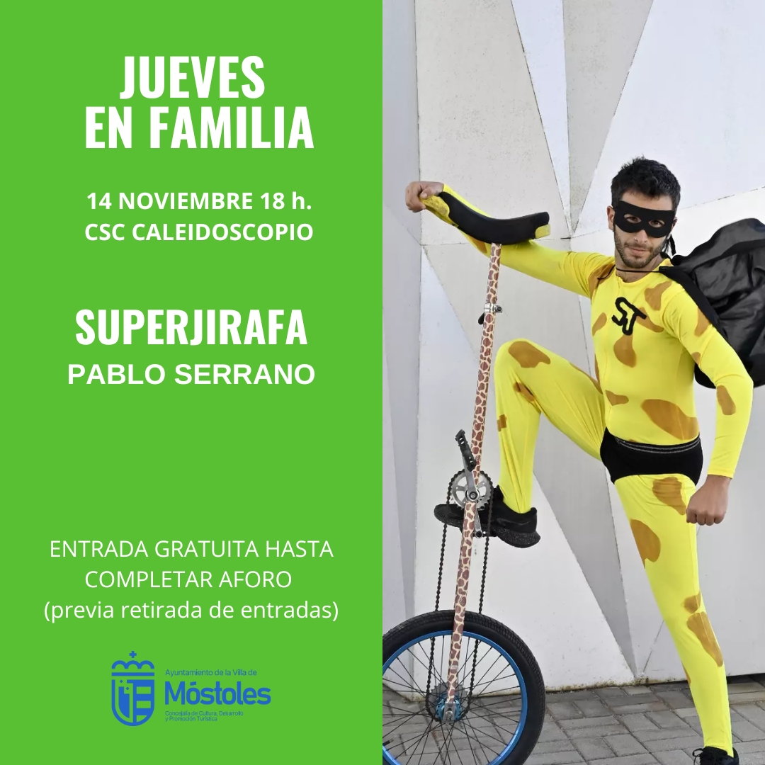 El artista Pablo Serrano vuelve a "Jueves en Familia" de la mano de su espectáculo circense "Superjirafa". Estará en el Centro Sociocultural Caleidoscopio el jueves 14 a partir de las 18:00 h.