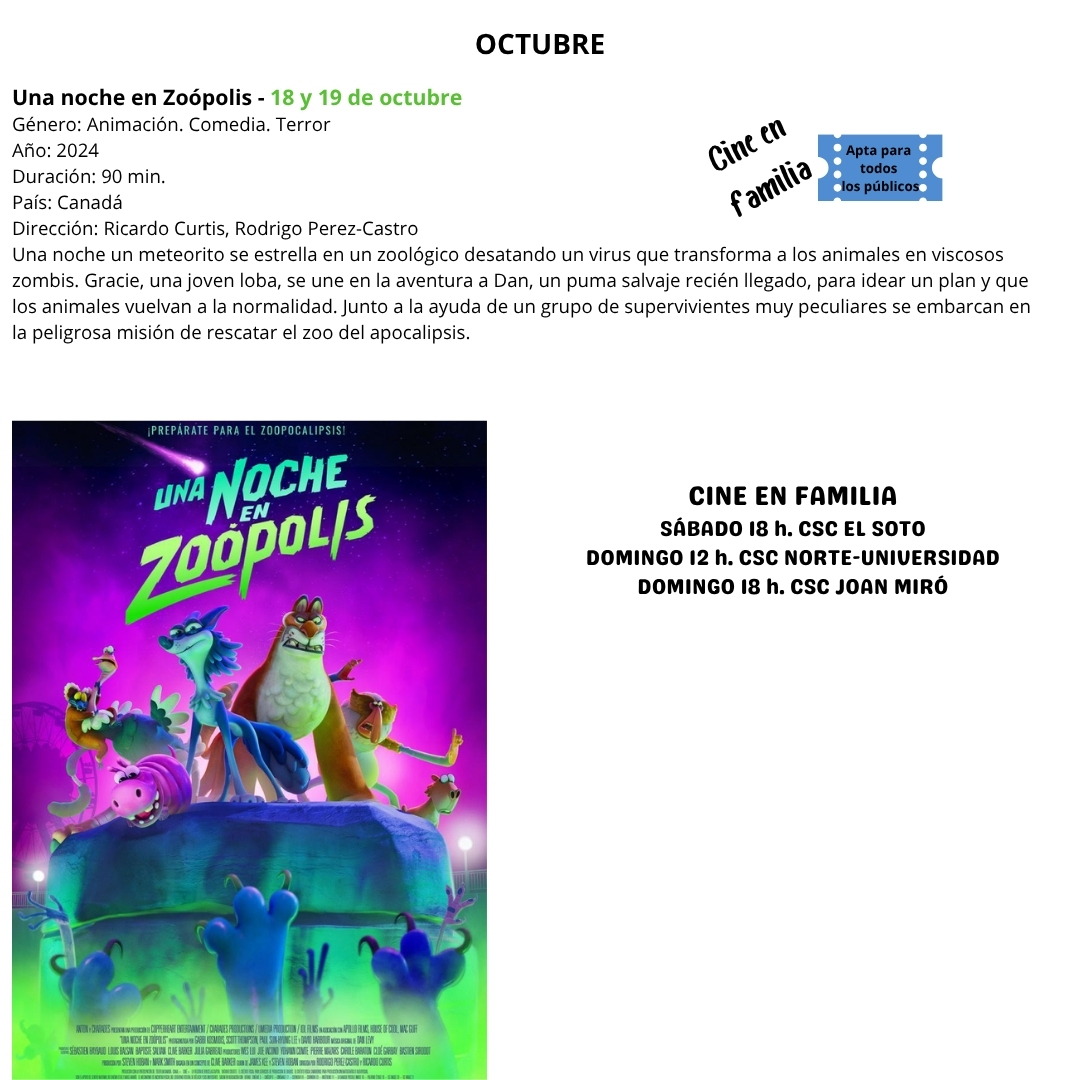 Y Cine en Familia proyecta esta semana "Una noche en Zoópolis", de entrada gratuita, en el Centro Sociocultural El Soto, el sábado a las 18:00 h; y el domingo 19, en el Centro Sociocultural Norte-Universidad, a las 12:00 h, y en el Centro Sociocultural Joan Miró, a las 18:00 h. Una película de animación para todos los públicos, protagonizada por animales que se convierten en divertidos zombies al caer un extraño meteorito sobre un zoológico. Todas las proyecciones se adaptan para que personas con dificultades auditivas y TEA puedan disfrutar de la película. La retirada de invitaciones puede hacerse desde el lunes en el propio centro, de 10:00 h a 14:00 h y de 17:00 h a 20:00 h.