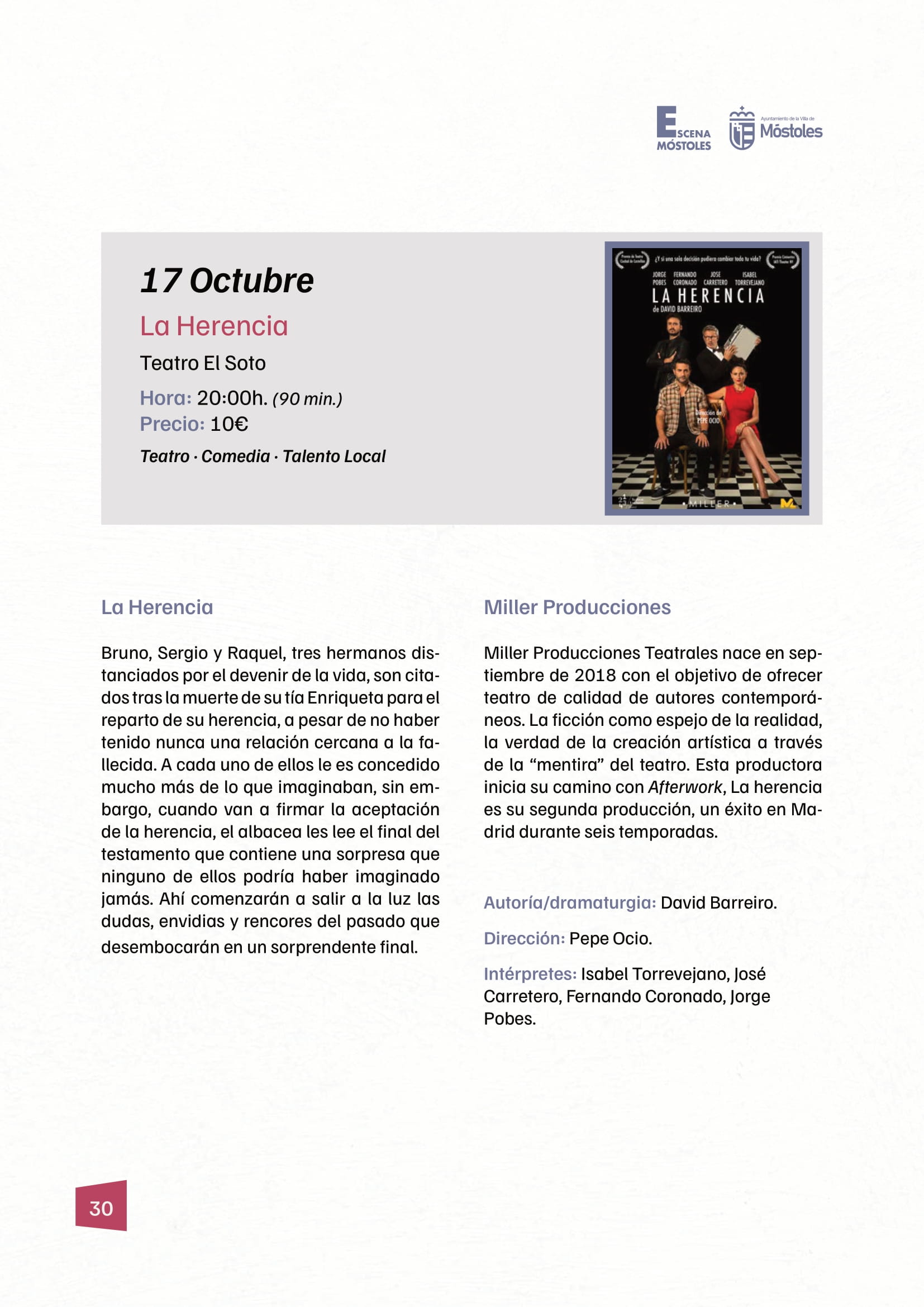 Y en el Teatro El Soto tendrá lugar la representación "La herencia", de David Barreiro, una comedia local que pone en escena la compañía Miller Producciones, a las 20:00 h y que pone en el centro de la trama a tres hermanos distanciados que, tras la muerte de su tía Enriqueta, son llamados para el reparto de la herencia, que les deparará sorpresas.
