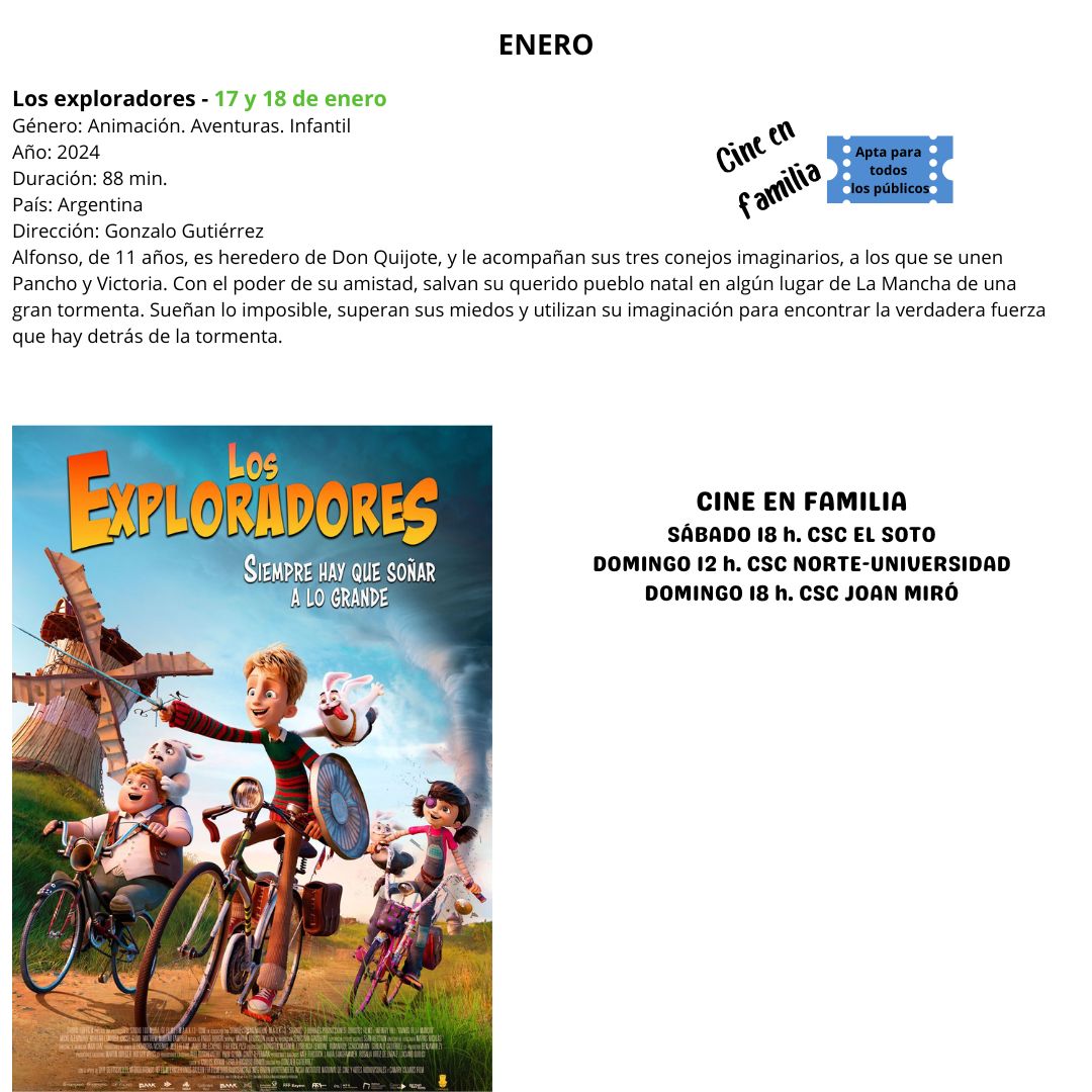 El sábado 17, dentro de Cine en familia, el Centro Sociocultural El Soto acogerá la proyección de la película "Los exploradores", a las 18:00 h, que también se proyectará el domingo en el Centro Sociocultural Norte-Universidad, a las 12:00 h, y en el Centro Sociocultural Joan Miró, a las 18:00 h. Esta película de cine de animación, para todos los públicos, cuenta las aventuras de un niño de 11 años, heredero de Don Quijote, acompañado de tres conejos imaginarios, y dos amigos, que juntos, sueñan lo imposible, superan sus miedos y utilizan la imaginación para encontrar la fuerza que hay tras la tormenta y que siguen el lema de que "siempre hay que soñar a lo grande".