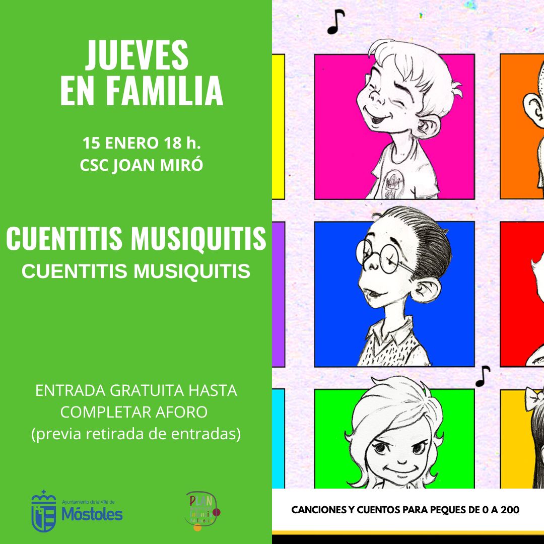 El jueves 15 continúa el espectáculo musical "Cuentitis Musiquitis", que ofrece canciones y cuentos, dentro de la programación de Jueves en Familia, a cargo de la compañía del mismo nombre, en el Centro Sociocultural Caleidoscopio, a las 18:00 h. La entrada es gratuita, previa retirada de invitaciones en el propio centro.