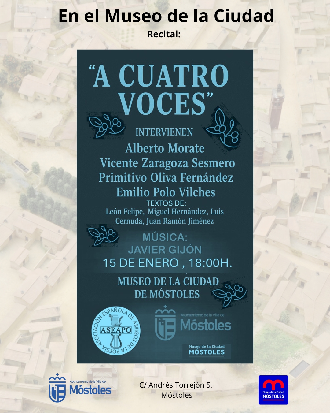 El día 15, también tendrá lugar en Móstoles el recital poético "A cuatro voces", a cargo de la Asociación Española de Amigos de la Poesía (ASEAPO), en el Museo de la Ciudad, a las 18:00 h. En él intervendrán: Alberto Morate, Vicente Zaragoza Sesmero, Primitivo Oliva Fernández y Emilio Polo Vilches, con música de Javier Gijón, que leerán textos de grandes de la Literatura como León Felipe, Miguel Hernández, Luis Cernuda y Juan Ramón Jiménez. La entrada es gratuita, previa retirada de invitaciones en el propio centro.
