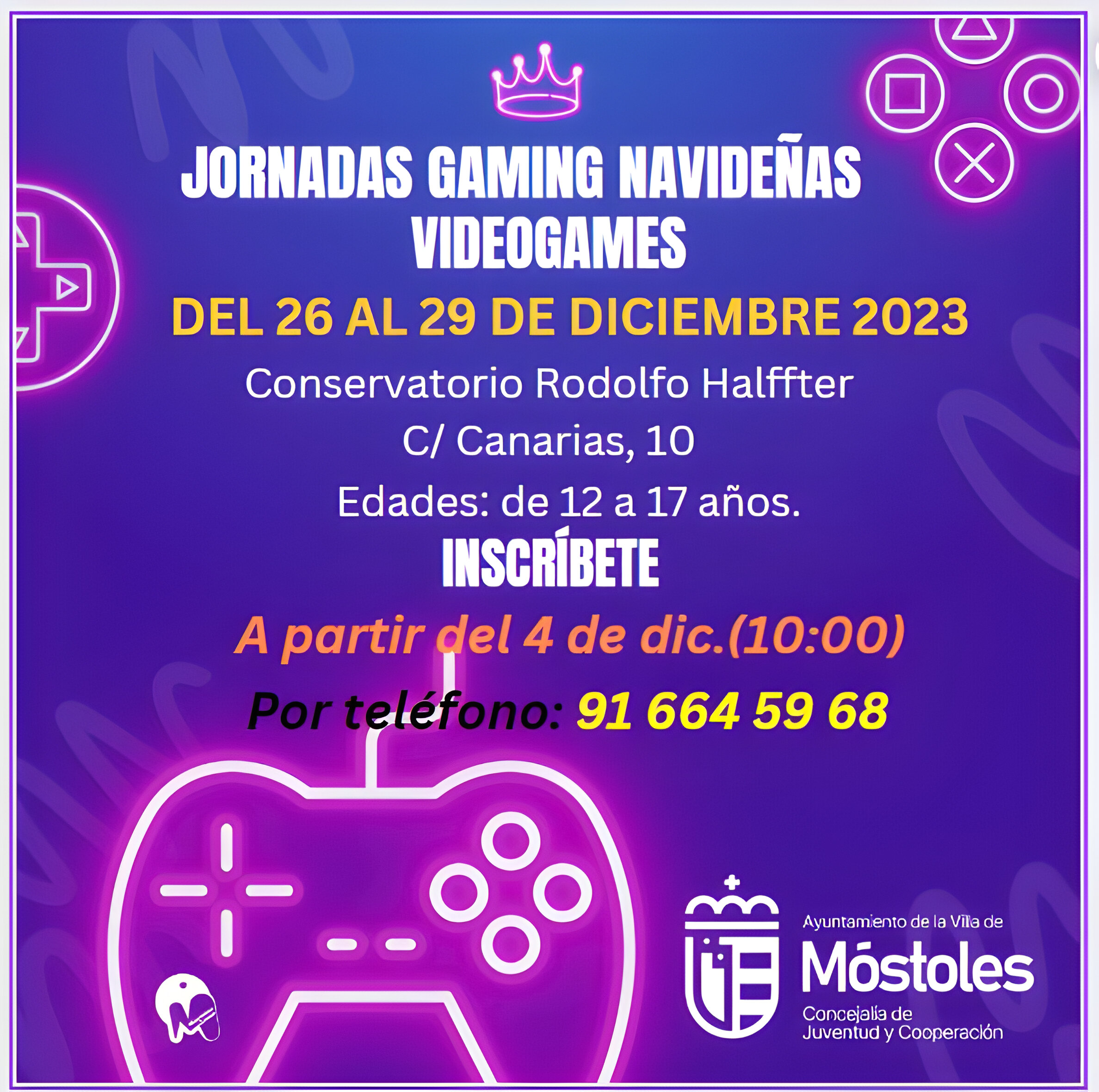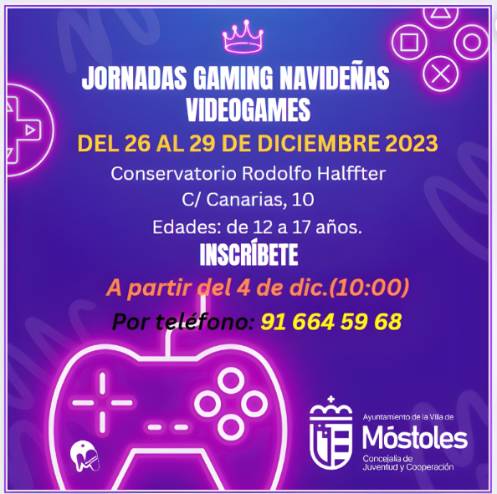 - El Ayuntamiento de Móstoles, a través de la Concejalía de Juventud y Cooperación, ha organizado estas jornadas de juegos electrónicos para adolescentes, entre 12 y 17 años, los próximos días 26, 27, 28 y 29 de diciembre, de 17:00 a 20:00 h, en el Conservatorio municipal Rodolfo Halffter.