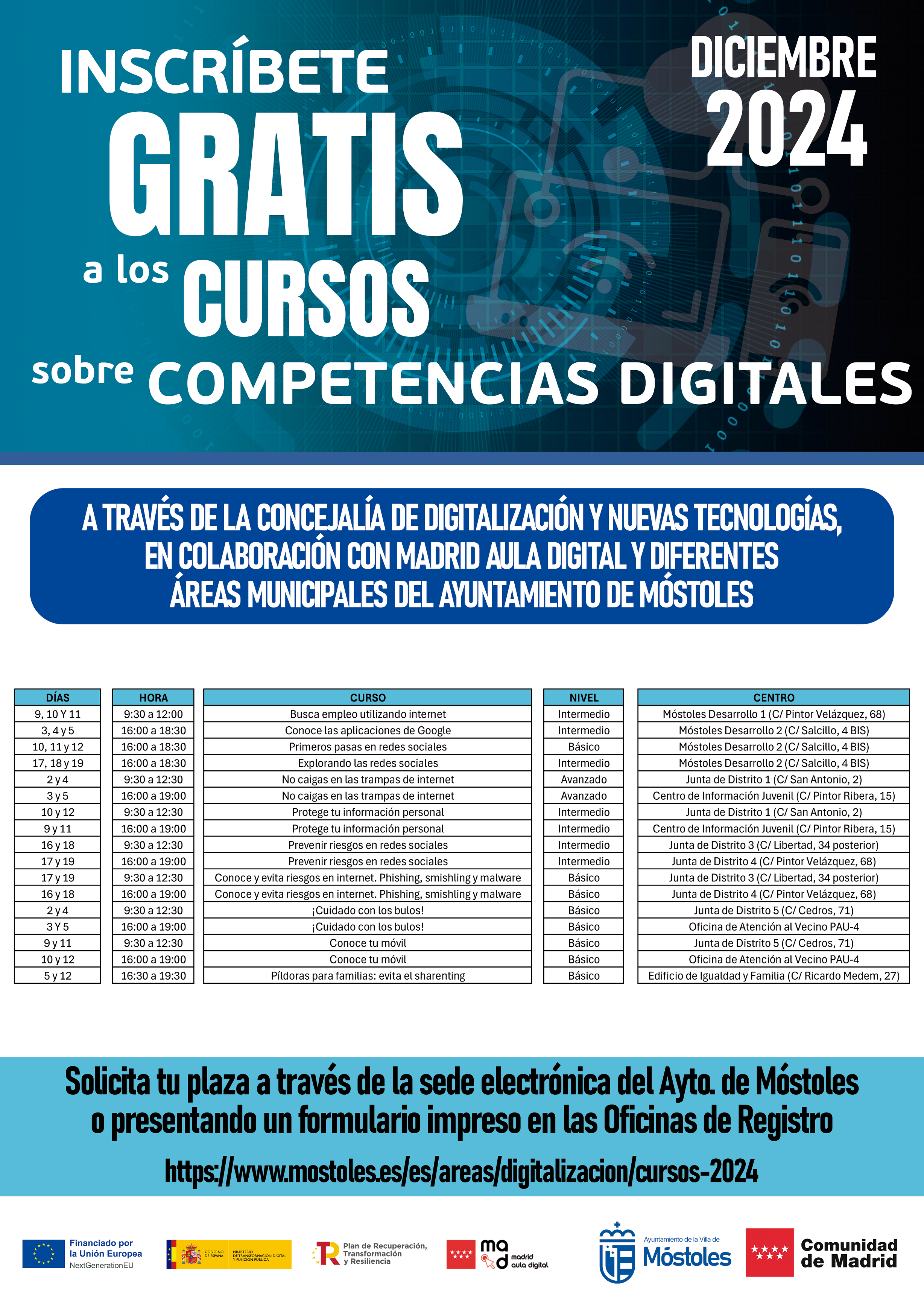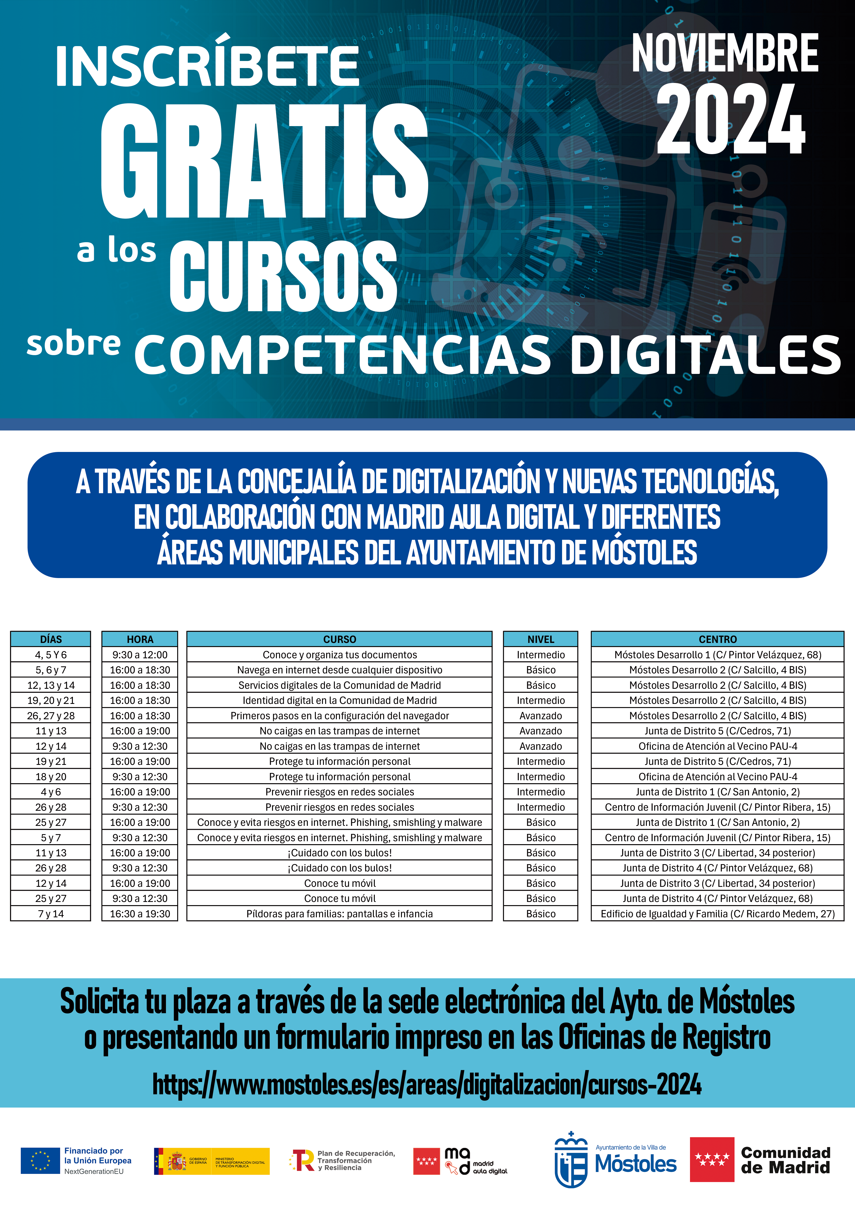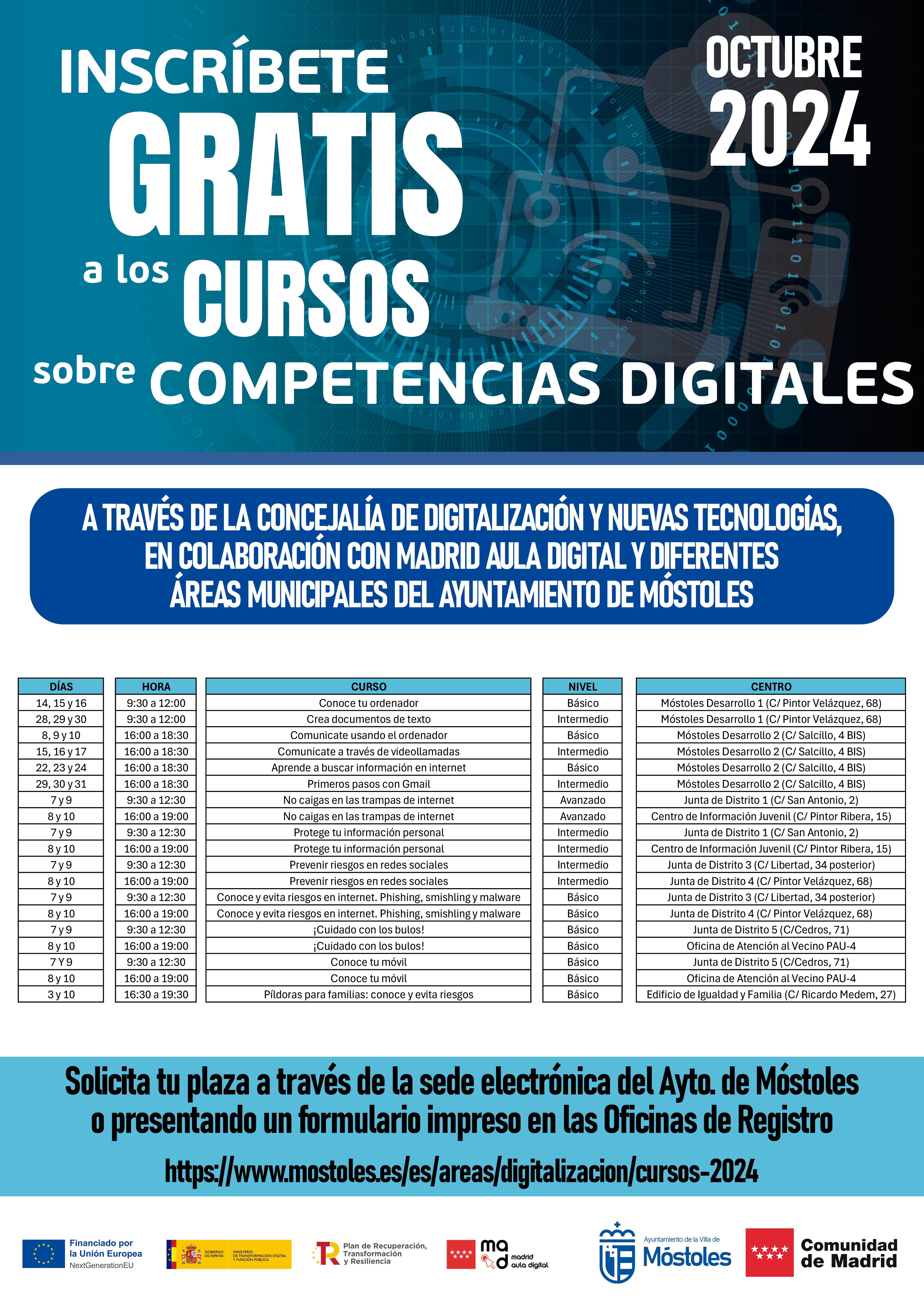 El calendario de cursos, las normas de preinscripción y el formulario de inscripción está disponible en el siguiente enlace: https://www.mostoles.es/es/areas/digitalizacion/cursos-2024
