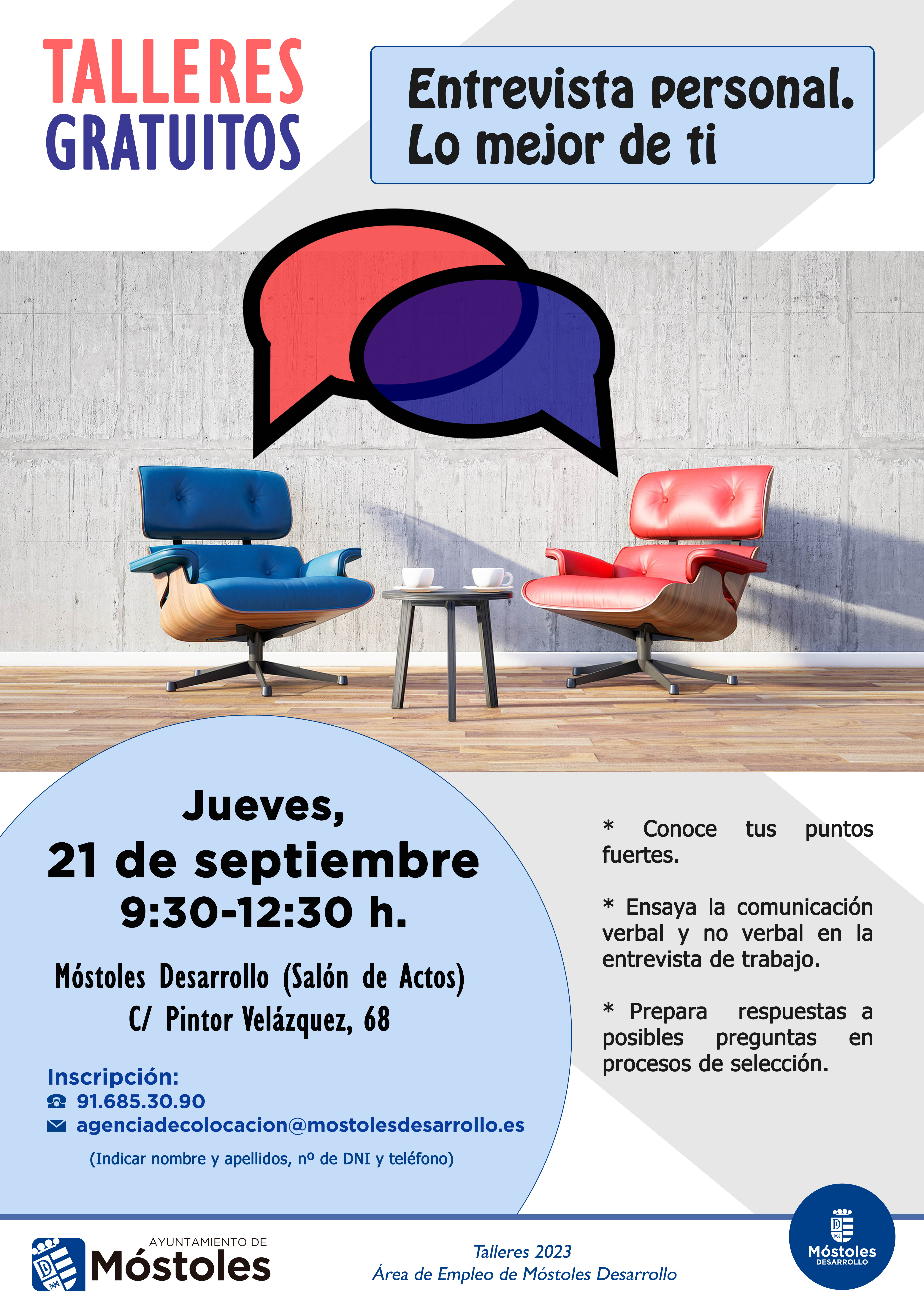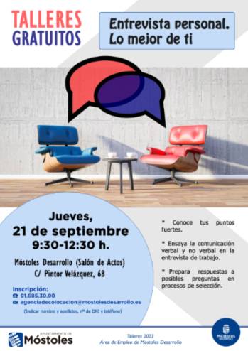 - "Entrevista personal. Lo mejor de ti". Este taller te ayudará a conocer tus puntos fuertes, ensayar la comunicación verbal y no verbal durante la entrevista de trabajo, así como a preparar las respuestas a posibles preguntas durante los procesos de selección. La primera edición se impartirá el 21 de septiembre y la segunda el 16 de noviembre.