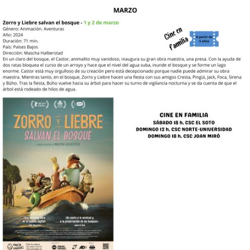 El sábado 1 de marzo, Cine en familia proyectará, gratuitamente, la película de animación "Zorro y Liebre salvan el bosque", en el Centro Sociocultural El Soto, a las 18:00 h, y el domingo podrá verse en el Centro Sociocultural Norte-Universidad, a las 12:00 h, y en el Centro Sociocultural Joan Miró, a las 18:00 h. Las invitaciones podrán retirarse desde el lunes en el propio centro, de 10:00 h a 14:00 h y de 17:00 h a 20:00 h.