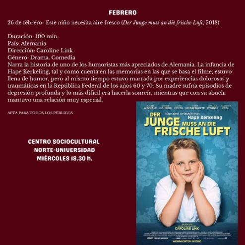 Y dentro del ciclo Filmoteca, que ofrece películas destacadas de la historia del cine, se proyectará la película alemana, "Este niño necesita aire fresco" (Der Junge muss an die frische Luft, 2018). El film, entre comedia y drama, dirigido por Caroline Link, se podrá ver el miércoles en el Centro Sociocultural Norte-Universidad, a las 18:30 h, con entrada gratuita, previa retirada de invitaciones en el propio centro.