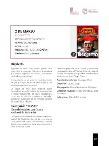 El domingo por la tarde la Compañía «Lgam», en colaboración con la Ópera Nacional de Moldavia, traen al Teatro del Bosque de Móstoles, a las 18:00 h, "Rigoletto", uno de los mejores libretos de ópera de la historia. La gran obra maestra del compositor italiano Giuseppe Verdi trata de un drama de pasión, engaño, amor filial y venganza que tiene como protagonista a Rigoletto, el bufón jorobado de la corte del Ducado de Mantua.
