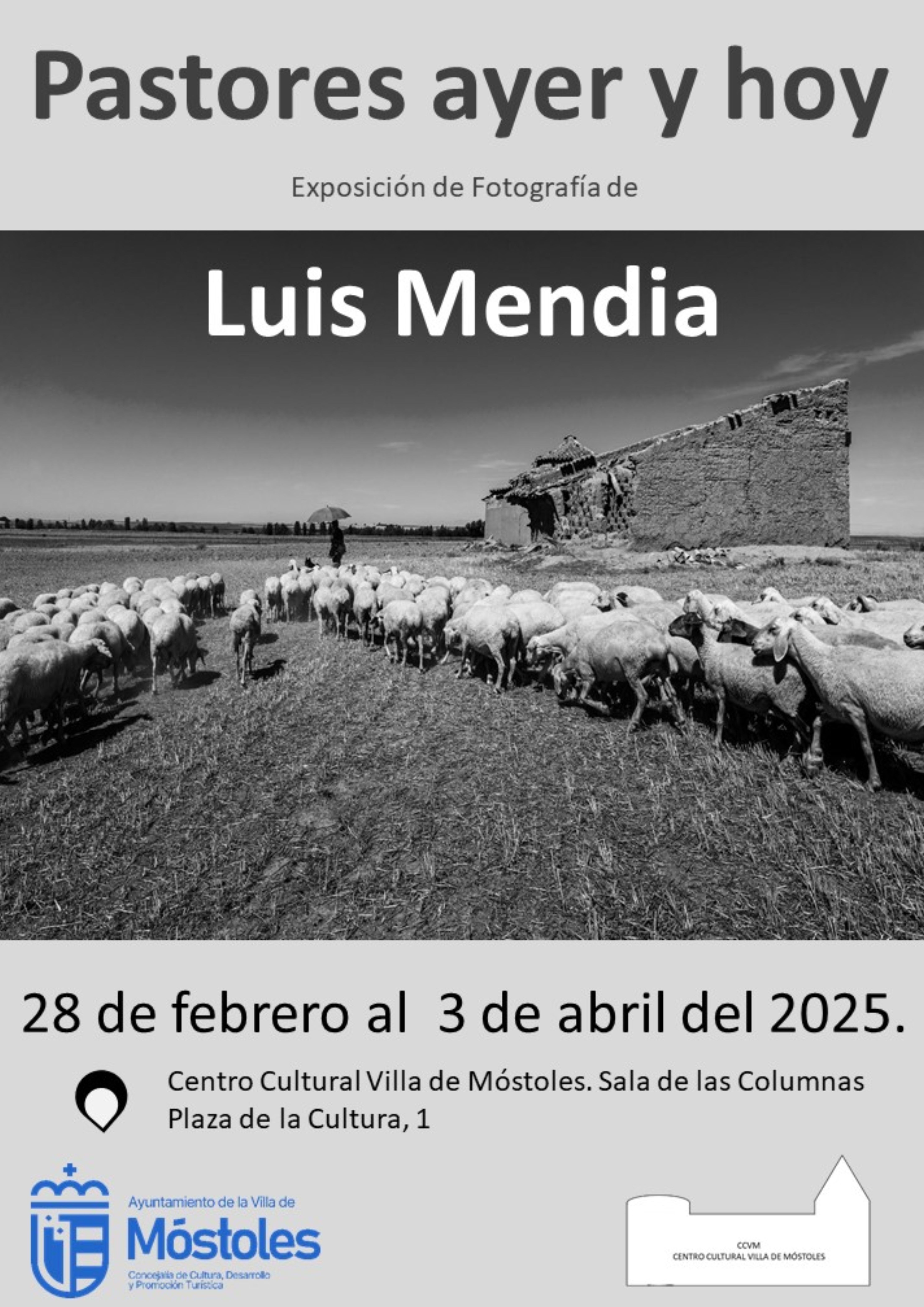 La agenda continúa durante el fin de semana. El viernes 28 comienza la exposición de fotografía del artista Luis Mendía, "Pastores ayer y hoy", en la Sala de las Columnas del Centro Cultural Villa de Móstoles, que se podrá contemplar hasta el 3 de abril, con acceso libre. La inauguración de esta muestra y una visita guiada se llevará a cabo el lunes 3 de marzo, a las 12.00 h.