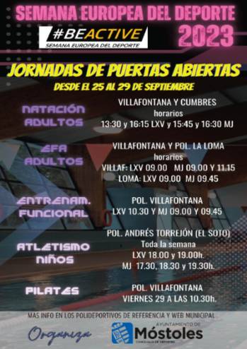 - Del 25 al 29 de septiembre, los mostoleños podrán asistir a clases gratuitas de natación, entrenamiento funcional, atletismo y pilates.