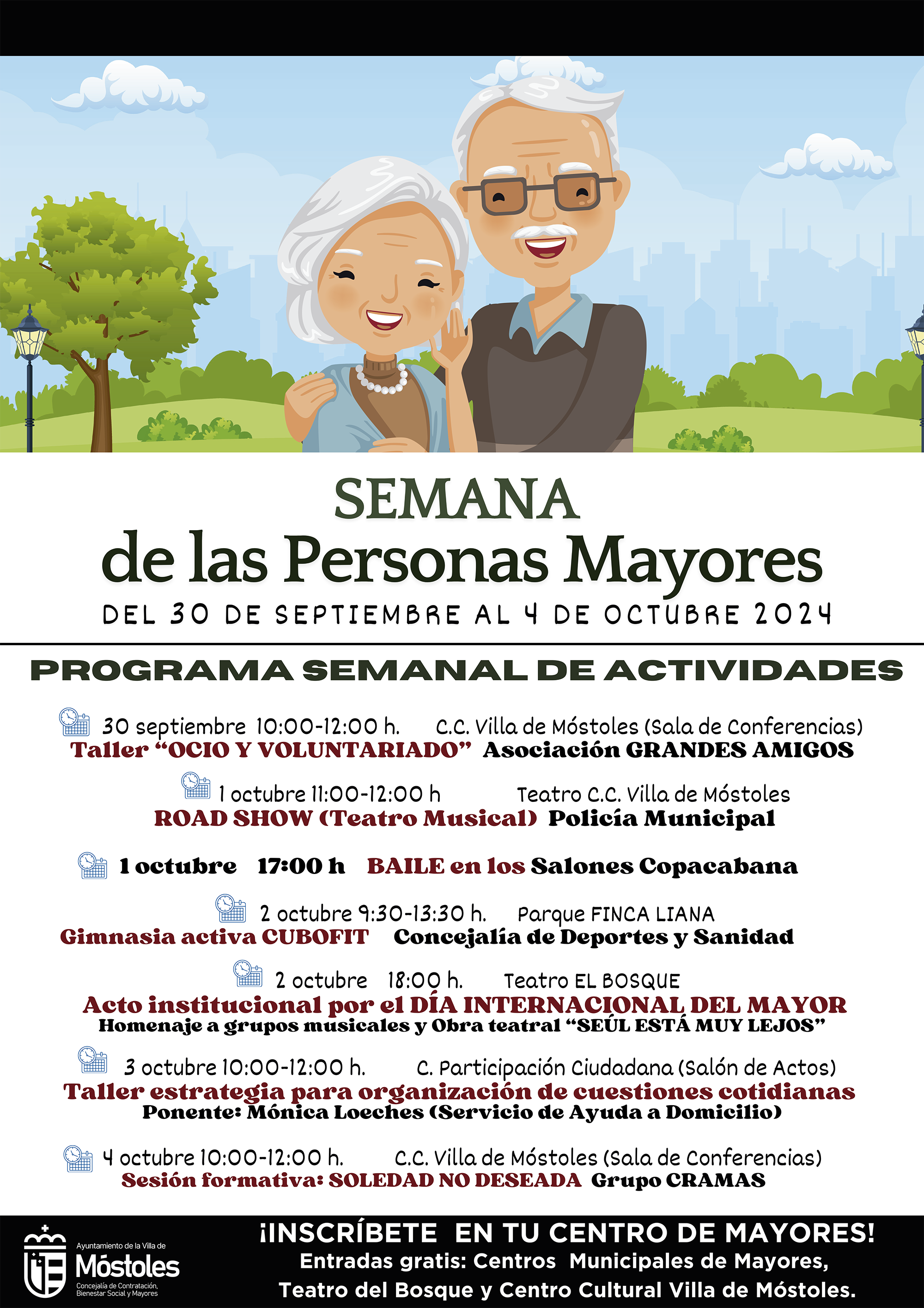 El Ayuntamiento de Móstoles, coincidiendo con el Día Internacional de las Personas Mayores, que se celebra el 1 de octubre, ha organizado, a través de la Concejalía de Contratación, Mayores y Bienestar Social, numerosas actividades para los mayores del municipio que se desarrollarán del 30 de septiembre al 4 de octubre.