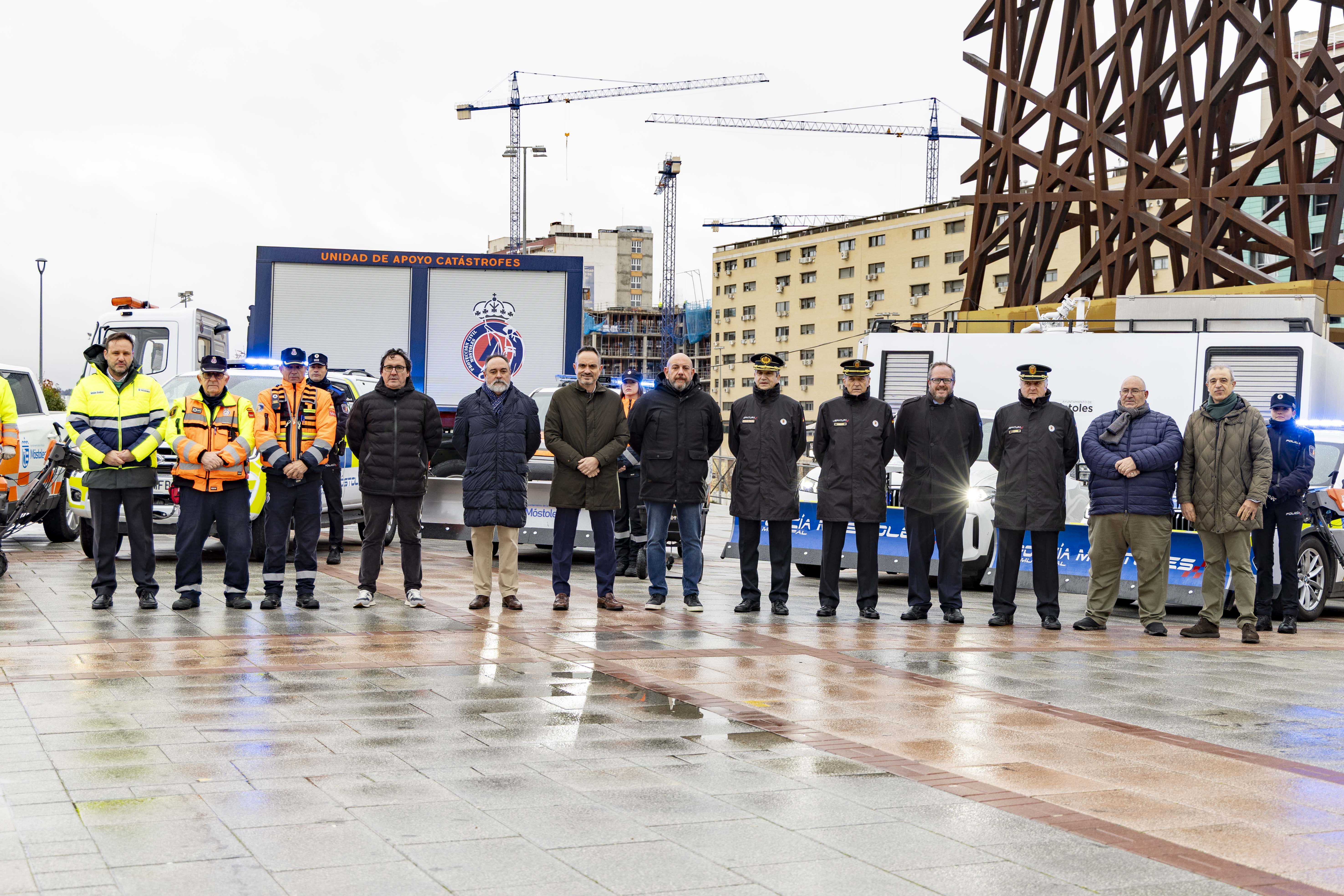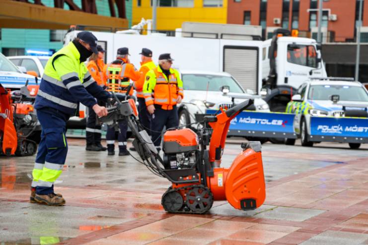 El Alcalde de Móstoles, Manuel Bautista, acompañado del primer teniente de alcalde y concejal de Seguridad, Emergencias y Medio Ambiente, Gabriel Monteserín, y del concejal de Urbanismo, Vivienda, Patrimonio y Mantenimiento de la Ciudad, Sergio Soler, han asistido a la presentación de una muestra de los medios que se emplearán en este plan transversal, que contempla una serie de medidas para combatir las condiciones climatológicas adversas de la época invernal, en coordinación con Policía Municipal, Bomberos y la Agrupación de Voluntarios de Protección Civil.