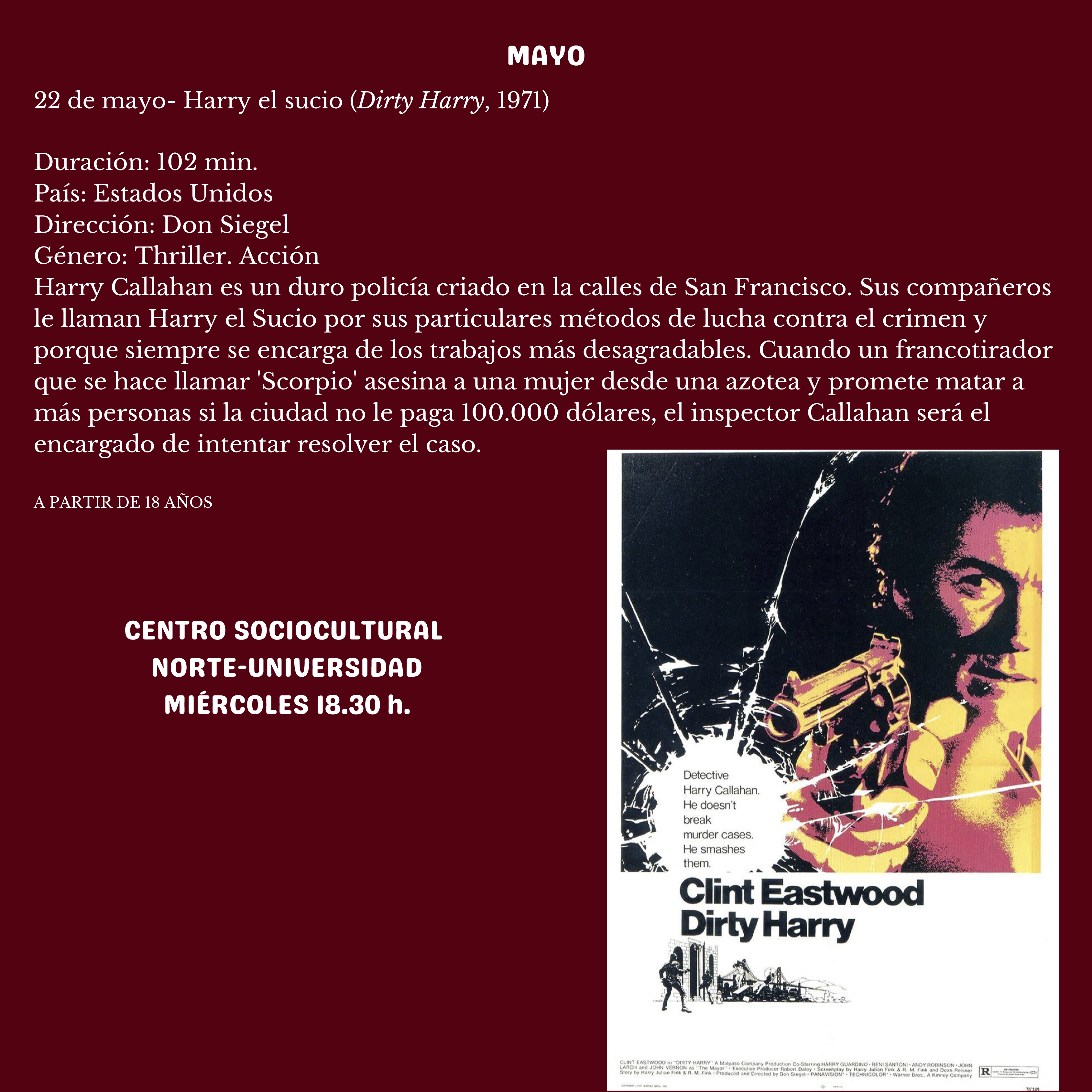 El miércoles 22, en el ciclo de cine Filmoteca se proyectará la película "Harry el sucio", en el Centro Sociocultural Norte-Universidad a las 18:30 h. Las entradas se pueden retirar, de manera gratuita en el propio centro desde el lunes 20 de mayo.