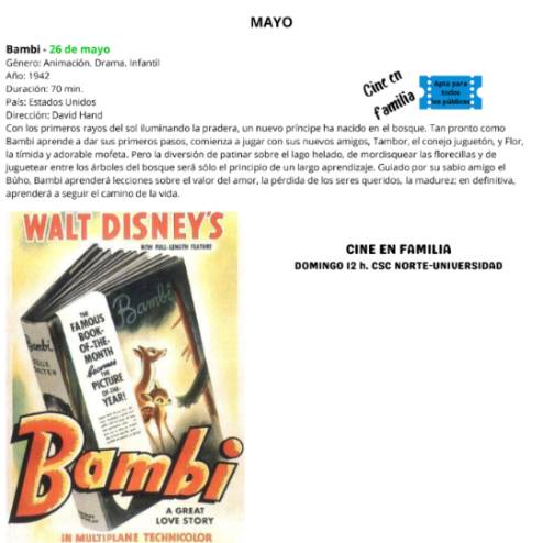 El Cine en Familia proyecta este fin de semana el clásico de animación "Bambi", el domingo 26 de mayo en el Centro Sociocultural Norte-Universidad, a las 12:00 h. La retirada de invitaciones podrá realizarse desde el lunes en el propio centro, de 10:00 h a 14:00 h y de 17:00 h a 20:00 h.