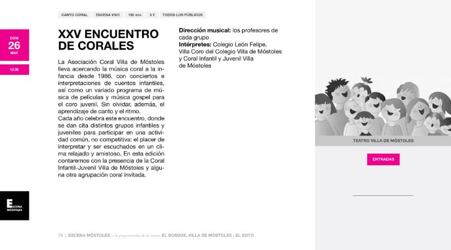 La mañana del domingo 26 de mayo tendrá lugar el "XXV Encuentro de corales", con la participación de varias agrupaciones locales como Villa Coro, del Colegio Villa de Móstoles, y Coral Infantil y Juvenil Villa de Móstoles, en el Teatro Villa de Móstoles a las 12:30 h. Las entradas podrán obtenerse a un precio de 3 euros, de manera online o en las taquillas de los teatros municipales.