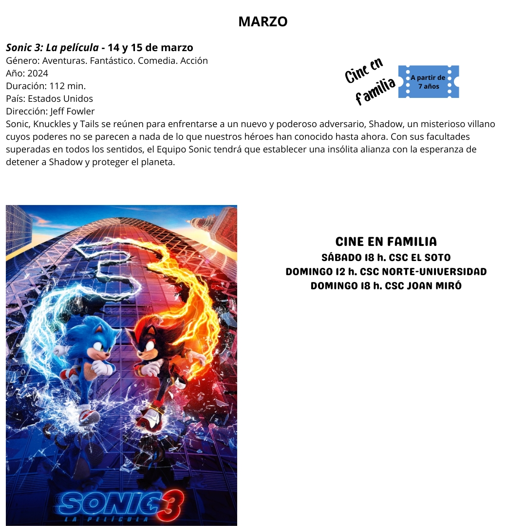Además, el sábado 14 tendrá lugar Cine en familia con la proyección gratuita de "Sonic 3: La película", en el Centro Sociocultural El Soto, a las 18:00 h, y el domingo 15, en el Centro Sociocultural Norte-Universidad, a las 12:00 h, y en el Centro Sociocultural Joan Miró, a las 18:00 h. En esta película, para todos los públicos, el equipo Sonic, integrado por Sonic, Tails y Knuckles, se enfrentará a Shadow, un misterioso villano, antes de que conquiste el mundo. La retirada de invitaciones se podrá hacer desde el lunes en el propio centro, de 10:00 h a 14:00 h y de 17:00 h a 20:00 h.
