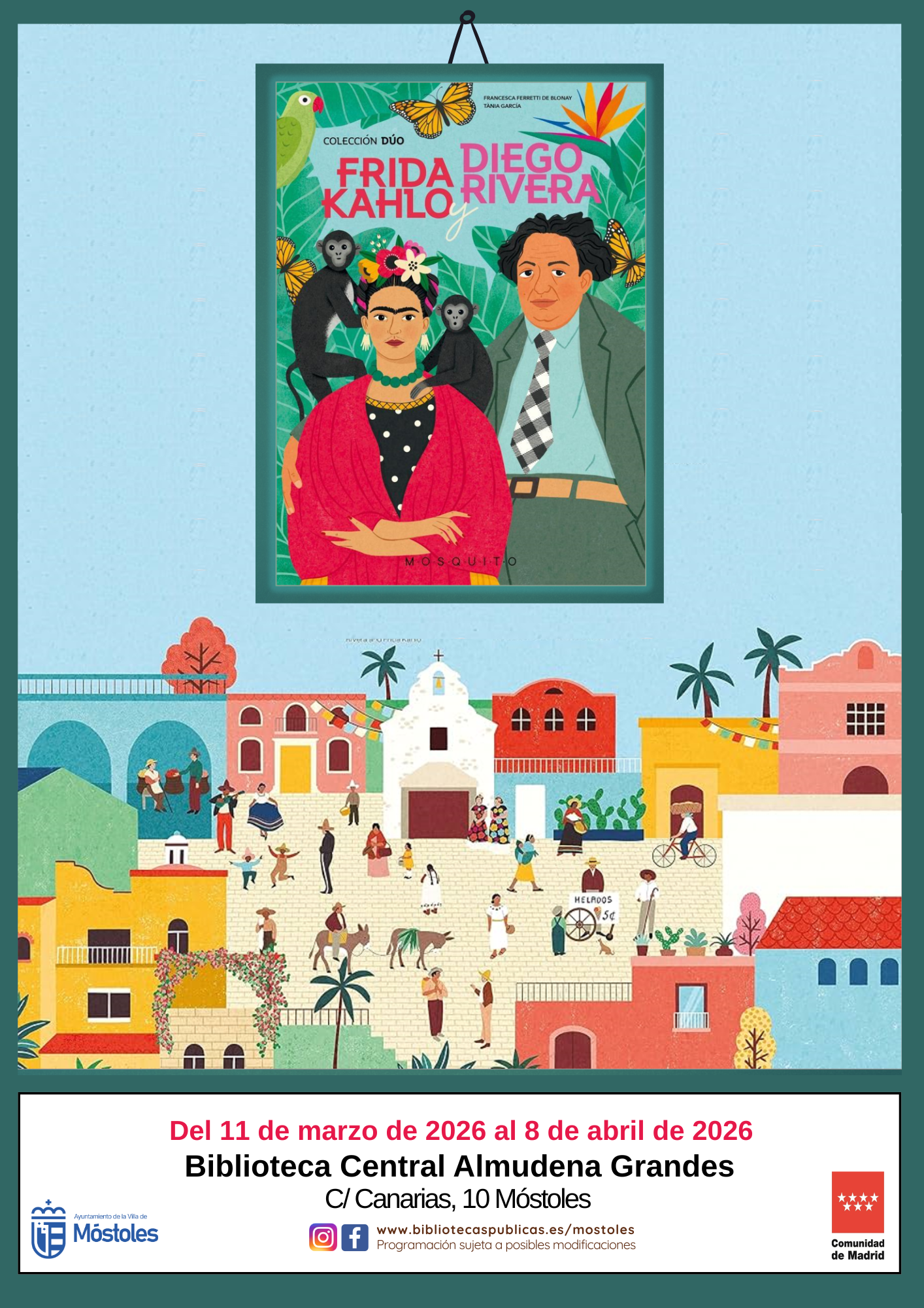 A partir del miércoles 11 se podrán ver las ilustraciones y bocetos recopiladas en la exposición "Frida Kahlo y Diego Rivera", organizada por la Red de Bibliotecas Públicas de la Comunidad de Madrid, en la Biblioteca Central Almudena Grandes. La muestra permanecerá hasta el 8 de abril.