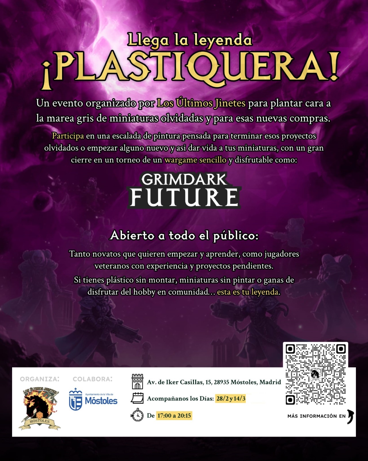 El sábado 14 de marzo se celebra "Llega la leyenda ¡plastiquera!", organizada por la asociación cultural Los últimos Jinetes, amantes del rol y los wargames, en el Centro Sociocultural El Soto, de 17:00 h a 20:15 h. Un evento abierto a todo el público en el que las miniaturas son las protagonistas. Los participantes podrán montar piezas, pintar miniaturas y disfrutar de este hobby en comunidad. La jornada concluirá con un gran cierre en un torneo, un wargame sencillo.