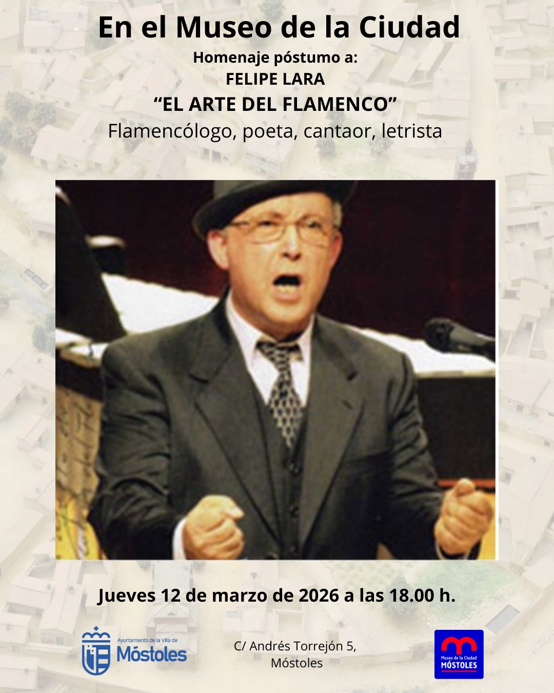 El día 12, a las 18:00 h, el Museo de la Ciudad rendirá un homenaje póstumo a Felipe Lara (flamencólogo, poeta, cantaor y letrista), con "El arte del flamenco",en el que intervendránFelipe Gértrudix (doctor de la UCM), Manuel Gértrudix (catedrático de la URJCI) y compañeros de ASEAPO. La entrada es gratuita, previa retirada de invitaciones en el propio centro.