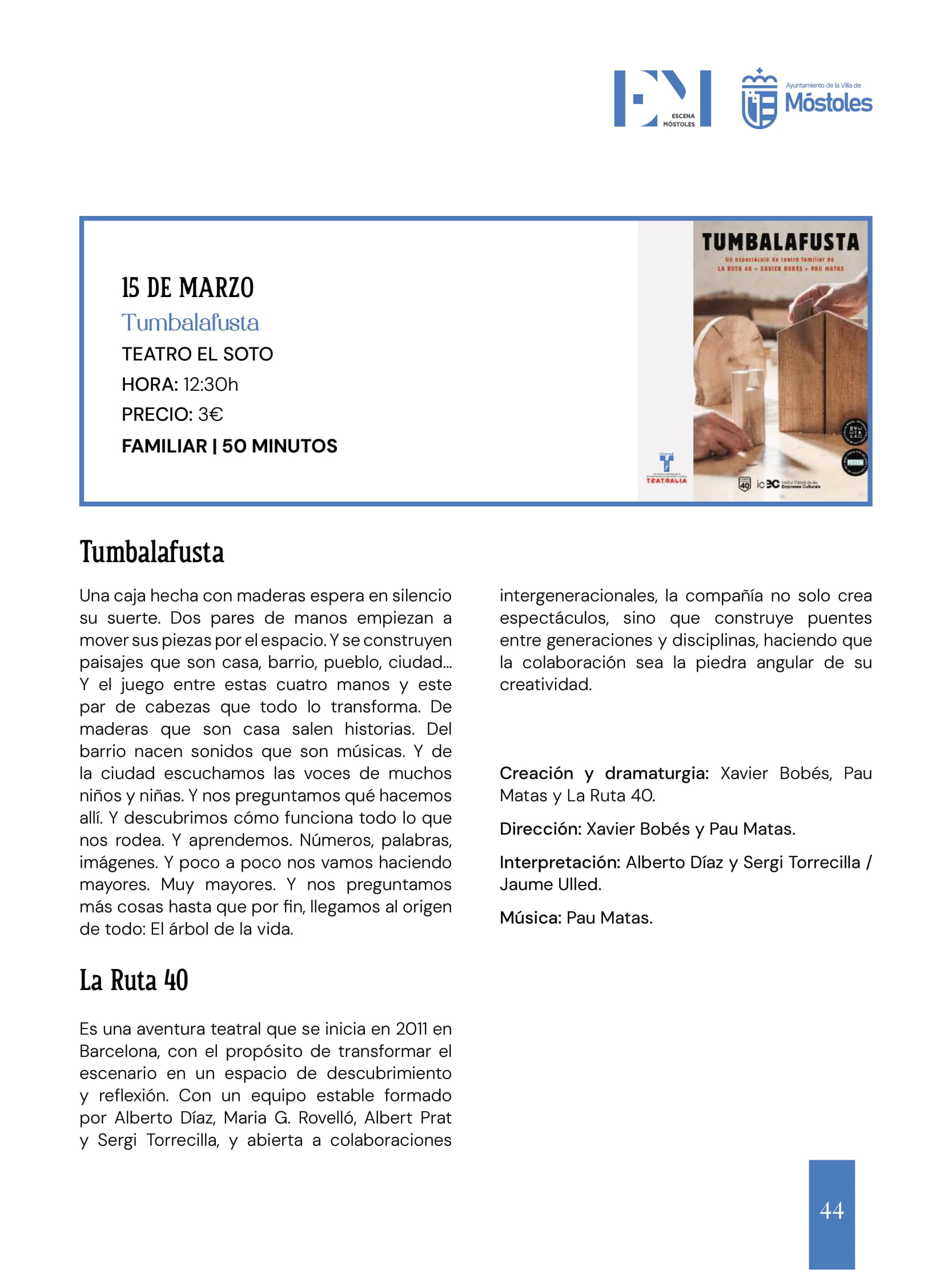 Por último, el domingo 15 de marzo, a las 12:30 h, se podrá disfrutar de "Tumbalafusta", una obra de teatro familiar a cargo de la compañía La Ruta 40, en el Teatro El Soto. Esta propuesta combina el teatro de texto, el teatro de objetos y la música y tiene a la madera como principal elemento a través del cual transmitir historias, paisajes, juegos, preguntas, imágenes o números al espectador haciéndole partícipe a través del conocimiento y la imaginación.